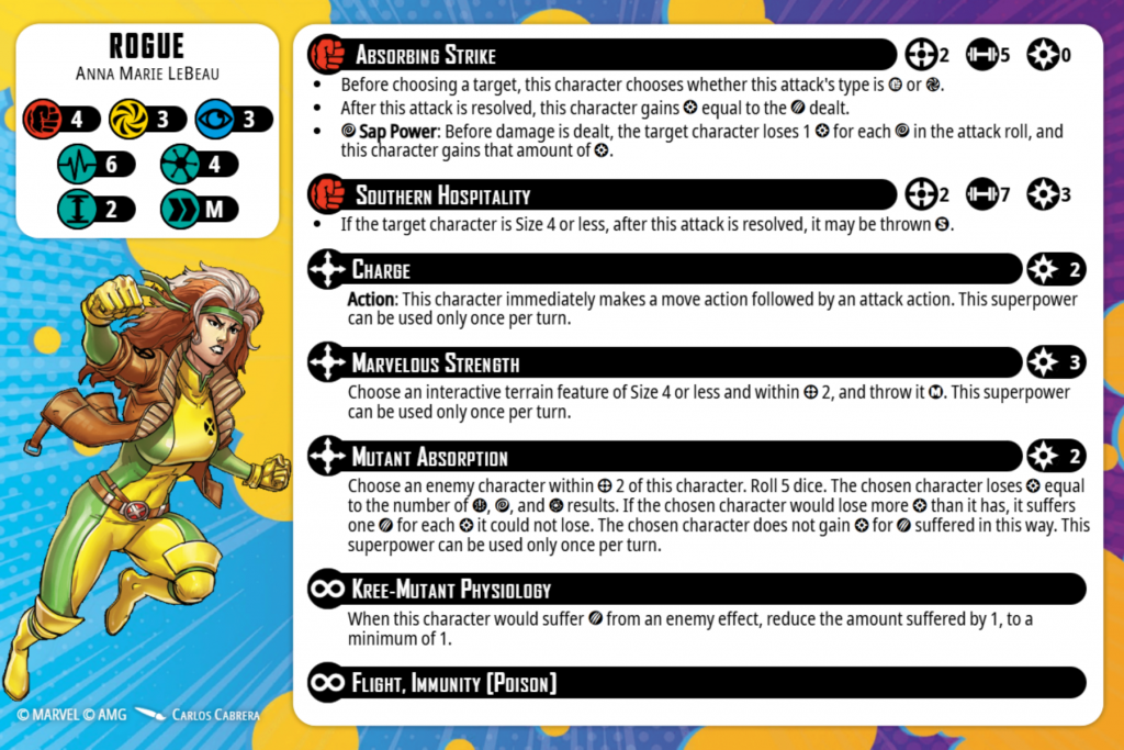 Southern Hospitality gives her a guaranteed Size 4 throw, perfect for throwing Hulk at his friends. Charge is very useful, especially under Cyclops or Magneto (oh yes, she’s affiliated to Brotherhood of Mutants too) where you can throw her an extra power to get it online in Round 1. Mutant Absorption can be crippling when used on the right model - and Kree-Mutant Physiology helps keep her around a little longer.