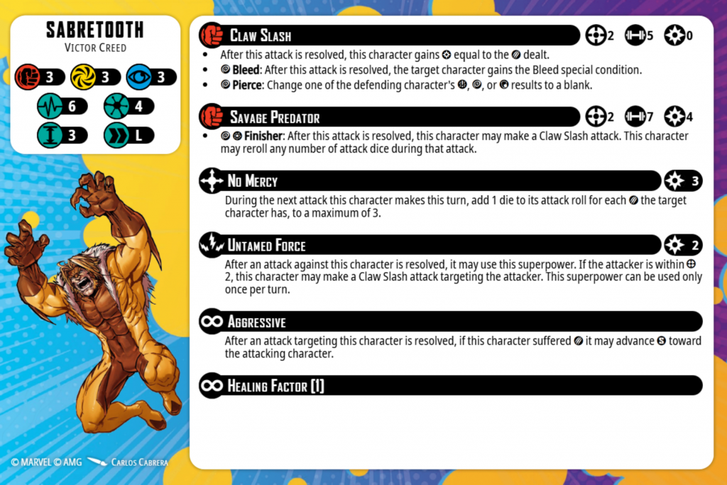 Healing Factor [2] is a big deal, especially with him having 7 health on his healthy side. If your opponent fails to finish him off, he will likely be able to hit them back harder and heal up some of the damage.