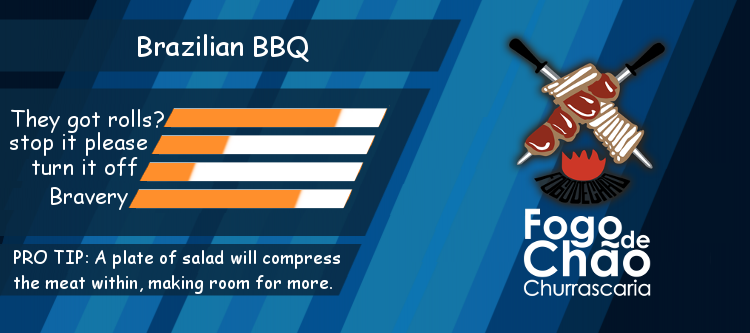 This is different from Americanized Brazilian BBQ, where you don’t really order at all, and the table isn’t (generally) on fire. Dudes bring around big swords covered in chicken wings and drop them on your plate until you beg them to stop, please, I have a family, I don’t need any more, someone help me. There happens to be one, a Fogo de Chao, right across the street from the Goonhammer Open venue. If you think I’m not going to finish my games, walk over there, eat so much steak I can’t feel my extremities, and call an Uber to take me the .05 miles back to the hotel, then buddy you must have not been reading Meatwatch for long.