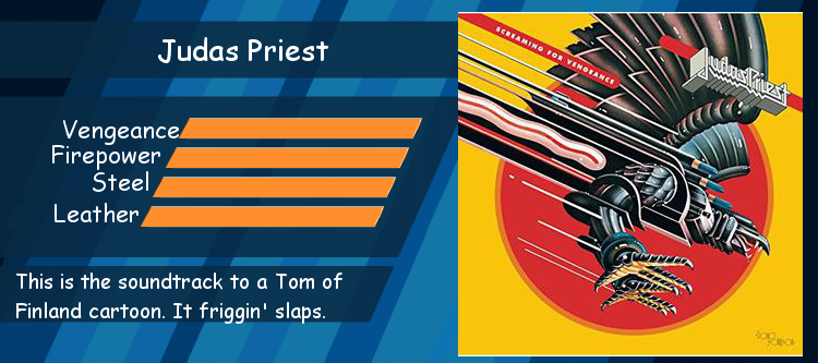 Here’s the official Meatwatch review of Judas Priest: they kick ass. Screaming for Vengeance isn’t the best Priest album - that’s either British Steel or Painkiller, though 2018’s Firepower isn’t bad either, which is impressive for how past their prime you’d expect them to be - but it does feature the hardest album cover art I have ever seen in my entire life.