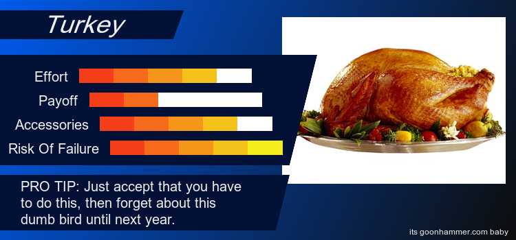 Look, we know what you’re thinking: This is by far one of our worst pun-based ideas. But Greg gets real pissy if we don’t let him just go to town roasting something, both literally and figuratively, every thirty to three hundred days or so. And so we present: Turkey.