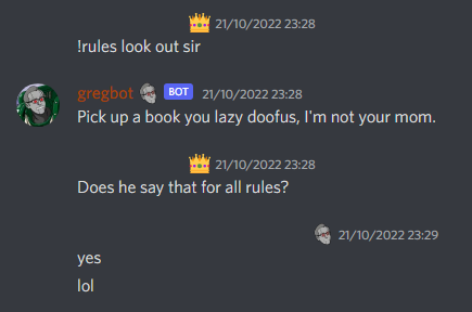 When I was new to our Discord, I fell into the trap of thinking that Gregbot could be called upon like Shrimpbot and you could consult him for Warhammer: 40, 000 rules. A useful feature for a site dedicated to 40K analysis! This was a cruel misdirection. Gregbot insults you if you try to ask for rules.