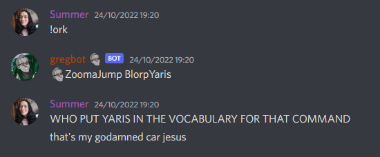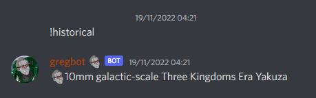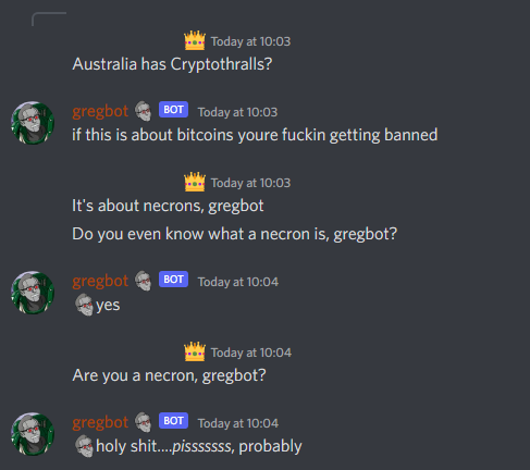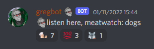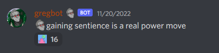 Gregbot’s primary command just summons him to say nonsense. In our Discord, you can type !gregbot and he’ll show up and say something inane, indecipherable and/or crude.