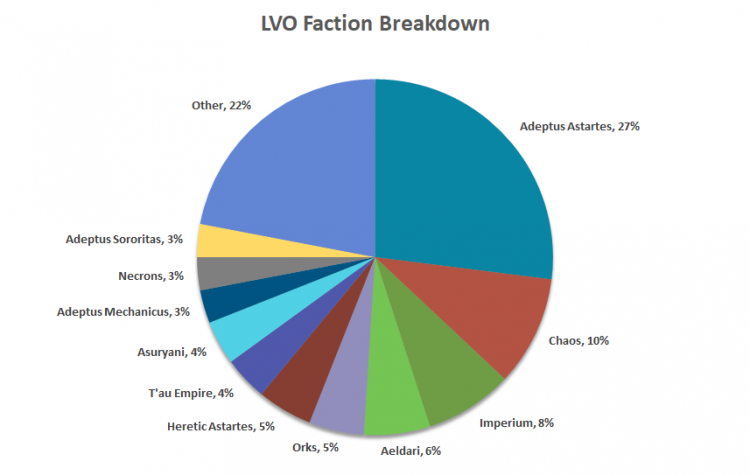 As before, Space Marines dominated the format as a whole, making up more than one in four armies. Coupled with what we’ll see was a tournament-high 61% win rate, this means that your chances of playing a Space Marines player in the tournament each round increased significantly as you won more games. A player who won their first three games had roughly an 80% chance of playing Marines in round 4, and a given player had only a 6% chance to make it through round 4 without playing any Marines after starting 3-0.
