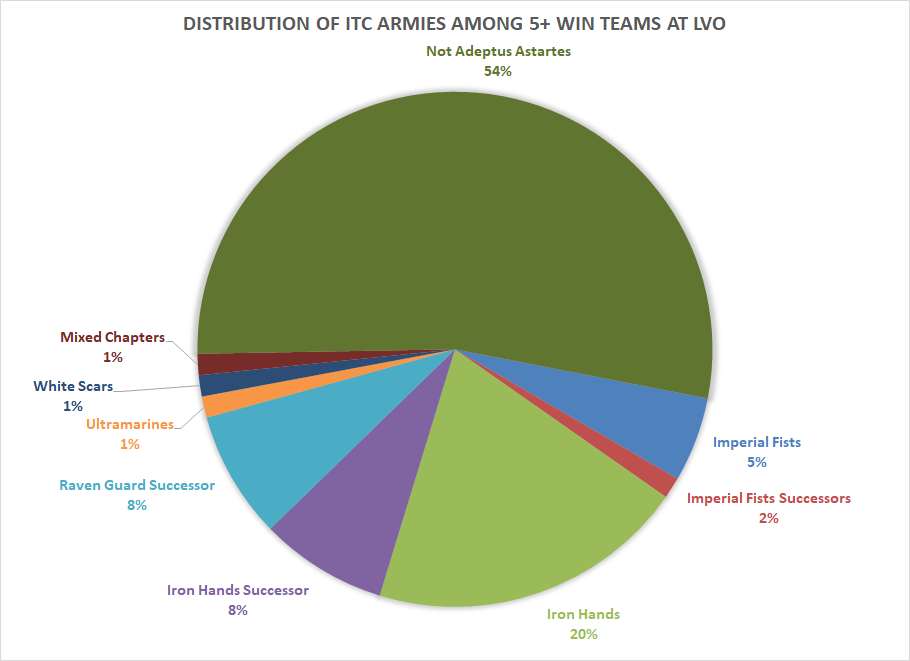 This isn't far off of what we've seen in our recent analyses and of course, this led to a disproportionate number of Marine armies in the top lists. If we refine our sample to just the lists that went 5-1 or better through the event's first two days, we can see this impact immediately, where Adeptus Astartes armies make up a whopping