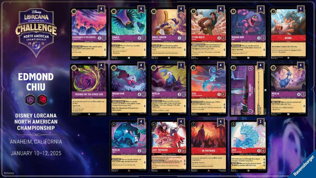Chiu’s deck was, to put it bluntly, pretty uninspired in terms of the build. However, his game-winning locations play was apparently a last-minute addition quite literally at the event itself and to put that bluntly, it was absolutely an inspired tweak to a deck I’ve been griping about since (checking notes) Rise of the Floodborn. This is all very standard stuff that any Lorcana player has seen time and time again- the full bounce package with a ridiculous amount of recursion, Madam Mims firing off all over the place, and plenty of hard Ruby removal including of course the full magazine of Be Prepareds. To be clear, by “pretty uninspired” I’m not slighting Chiu’s decision to run it at all- he clearly understood the assignment and brought out something very tried, true, and tested. His piloting and moment-to-moment decision making is what won the day especially given all the other variations on this deck that were in the field