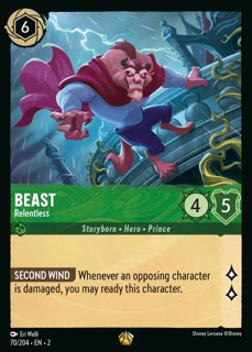 I could almost write the same blurb for this card as Beast – Relentless. When this card was first shown, people flipped their churros. It sounded awesome, and who doesn’t want to see Belle as a stealthy archer? It also seemed like an ideal fit for Emerald discard. But she was hard to play right, and she required too much setup for a payoff that didn’t necessarily win you the game. As discard adjust to the new rotation, I’m hoping to see new ways of looking at this card- hopefully with some cool new artwork to boot.