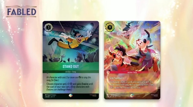 Fabled is also going to include a whole new rarity level above Enchanted and, well, as someone who’s never pulled an Enchanted out of hundreds of packs I’m excited for everyone else to enjoy these new cards, which will include a stunning Mickey and Minnie pair. The more exciting thing as far as I’m concerned is the debut of The Goofy Movie and the fact that they bowed down to my demands to make “I2I” a song card- and with an Iconic version at that. The cards shown so far look awesome. I was also surprised to see that Dumbo is appearing in the new set because you kind of forget about Dumbo, you know? Dumbo is a classic and all but with some pretty nasty racial stereotyping going on it and I’m not sure it’s really as timeless as some of the other Disney masterpieces. But hey, I’m glad to see the elephant swooping in and he’s got a beautiful Enchanted to show for it.