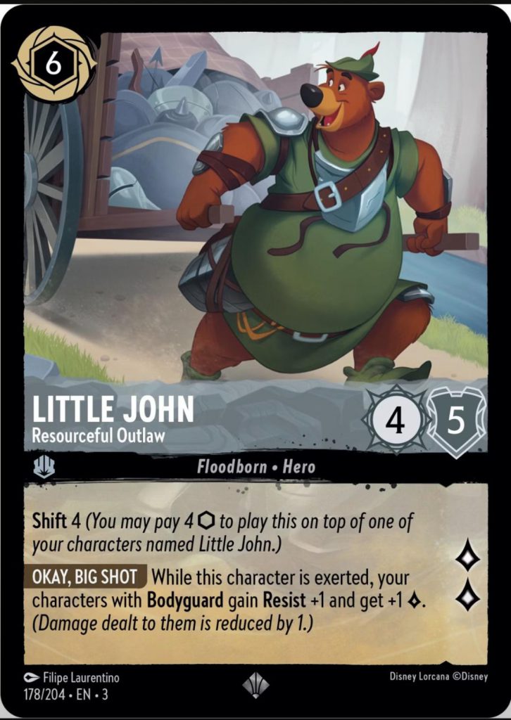 Robin Hood’s best buddy Little John appears a couple of times, and in better form than his ROTF draft chaff debut. Resourceful Outlaw is a 6 ink Floodborn shifting at 4 that gives characters with Bodyguard +1 resist and +1 Lore. That is a potentially great utility piece as he not only supports the Bodyguard function, he also improves the questing ability of cards that tend to have 1 or 2 Lore. For example, Little John’s other version in this set, Robin’s Companion, is a 3/2/4/1 Bodyguard that benefits from his own upgraded version if both are on the field. And this Storyborn ally is Evasive to boot. I’m especially glad to see all of this synergy because I think having Bodyguards to keep the Sheriff, Champion of Sherwood, and Capable Fighter on the table will be key.