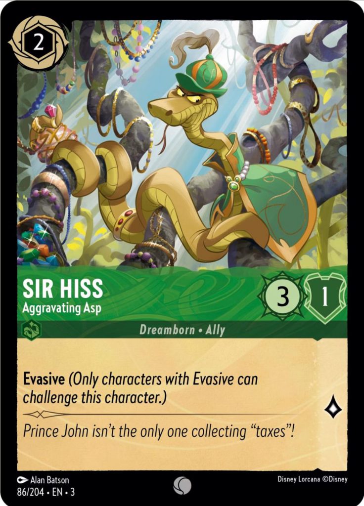 Skippy, Energetic Rabbit offers a solid 2/2/2/1 option with Ward and Sir Hiss, Aggravating Asp comes in at 2/3/1/1 and Evades so if Robin’s Companion doesn’t takeout that Pascal he can. Nutsy, Vulture Henchman also shows up and he’s pretty boring card but you’re not going to run him with all of this because – get this – those Merry Folks at Ravensburger thoughtfully made all of the cards named above, with the exception of the Sapphire Unrivaled Archer, Emerald and Steel. As an Emerald/Steel player, my heart skipped a beat. And I can finally use my four Steal from The Rich cards from The First Chapter and stay in theme. That’s right- my first deck for Into the Inklands is going to be as much Robin Hood as possible. Don’t care if it’s not “meta”. Because it will be awesome, and I’m making a custom playmat for it.We haven’t seen everything yet, but I’m still hoping to see Maid Marian, Rooster, and a Robin Hood location at the least. Hopefully in the Emerald/Steel livery, right and proper.