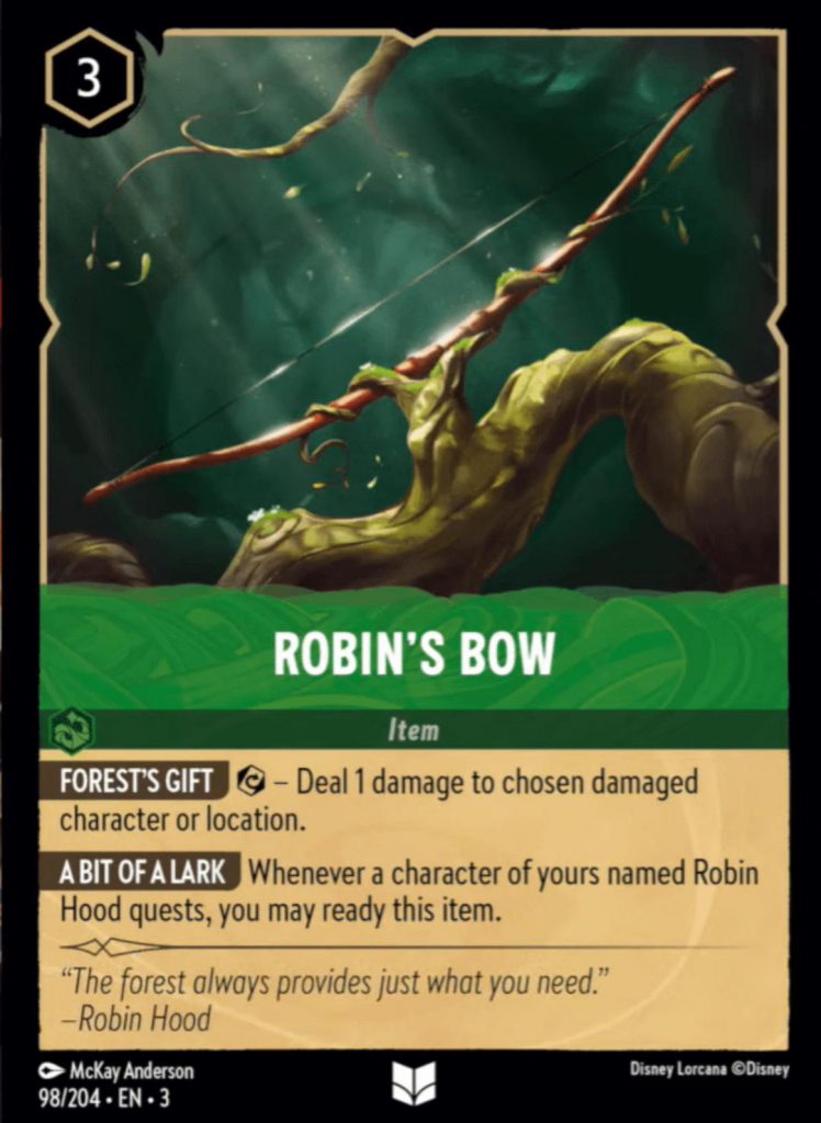 Robin’s Bow is a tremendous item specifically tooled for all of the above, dealing 1 damage on exertion and readying whenever a Robin Hood quests. The combos write themselves, folks.But that’s not all to this theme. There’s an absolutely killer combo with A Whole New World from The First Chapter, Prince John from ROTF, and the new Sheriff of Nottingham, corrupt official. Pop off AWNW, deal 1 damage for every card you discard, and you get to draw a card for every card your opponent lost. It’s wild. The Sheriff is also an excellent counter to everybody’s least favorite wheel, because if you are forced to dump 5 cards you will be reciprocating that to opposing characters.