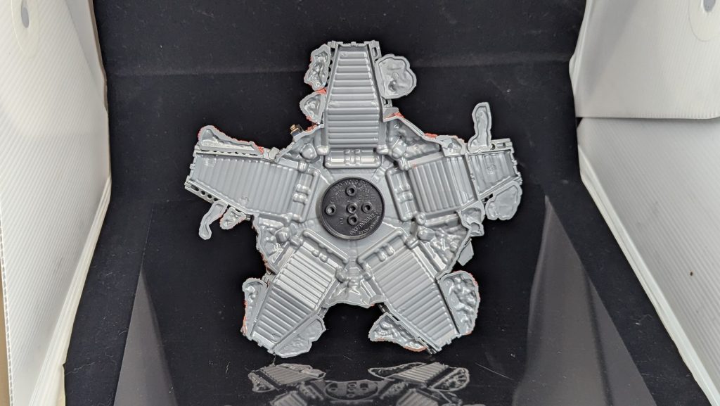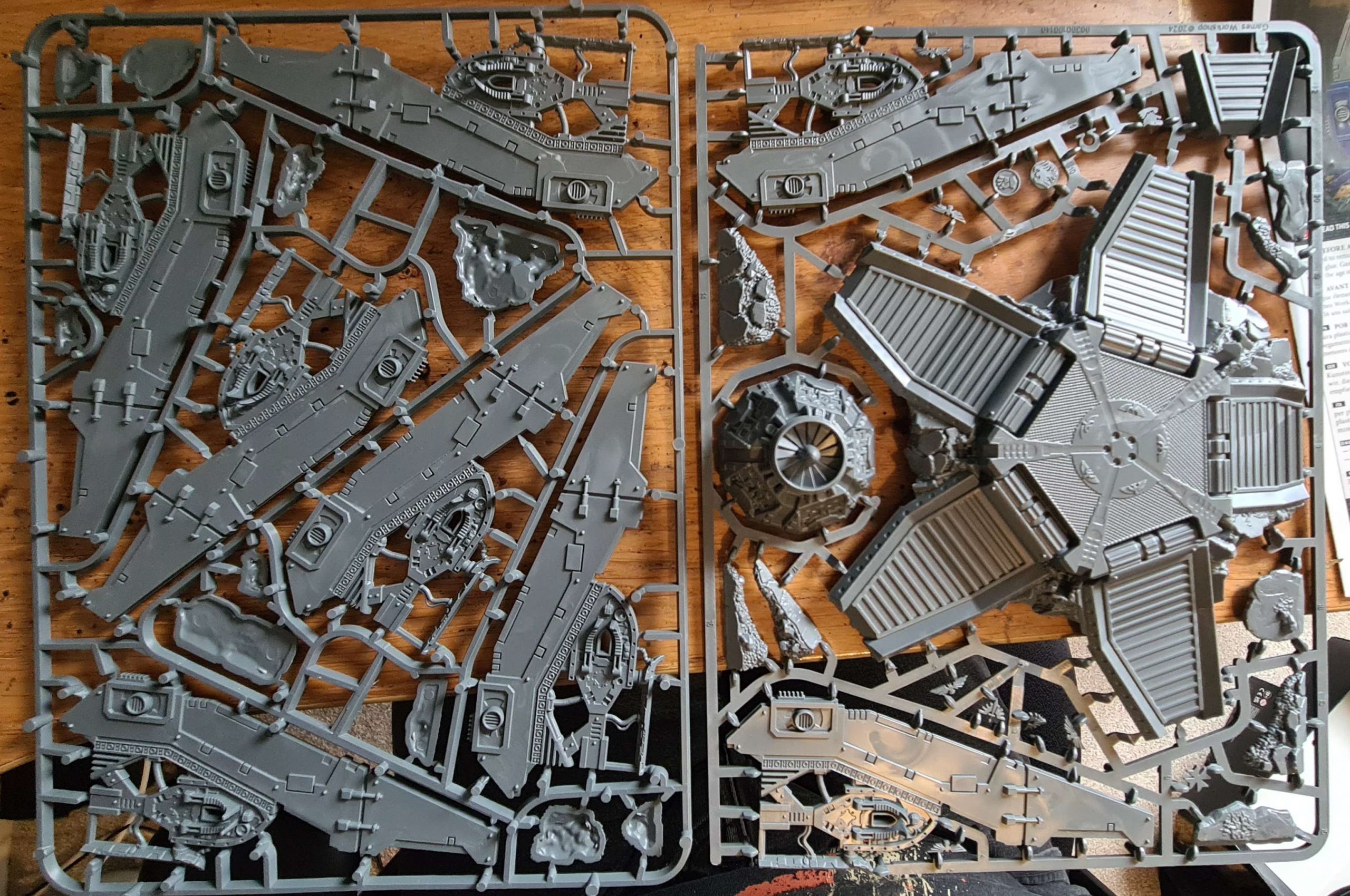 SRM: The first thing I realized when cracking the box open was that the plastic on this was thick, and so were the mold lines. Details are also a little softer than what I'm used to. If anything, this feels like the same plastic that most GW terrain is made of, though it's not made in China like some of their older terrain. The mold lines are particularly stark, but they're fortunately running down long, flat expanses of plastic that are easy to trim. Actually building the thing took like forty minutes. You've got the base, with the already-open petals down, plus a single half-door that glues on. Aside from that it's just the five vanes that make up the structure of our ballistic space artichoke, the thruster on top, and that's kind of it.