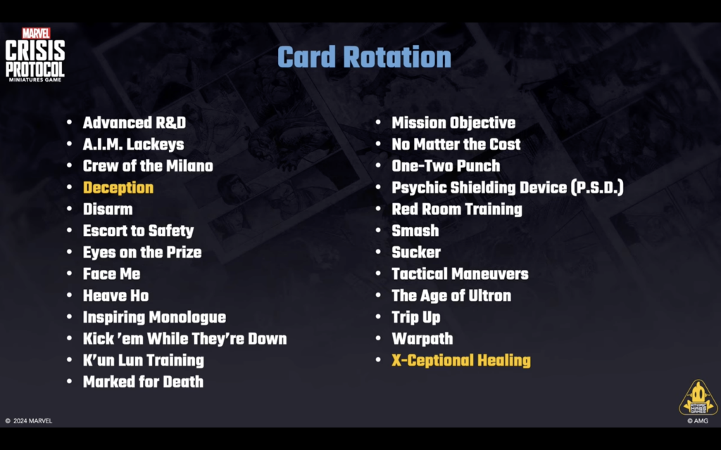Magos Sockbert: Deception was my baby, and RIP to her. I’d have much preferred they made it Brotherhood only, but I can see why it went; you either knew how to play a specific way to get around it and you were fine, or you weren’t and someone got Hulk’d. Stolen Identity is… fine? Maybe? Only being able to pull away unactivated models makes it pretty unattractive, since you can no longer draw someone in to hit them, and you can’t even pull them off a point since they’ll just walk back on. I’m a little worried that all it’ll do is trade a TTC for a walk action, and that’s not a trade I’m probably willing to make. Instant Recovery was the other big change (still unclear why they killed cards and replaced them with very similar ones, rather than just errata the originals), and while it’s not remotely as good as X-Ceptional, good. It’s replacement is neat, situational, and a much better card since it now probably makes your ten and you have to make the choice as to if it makes a five; nothing in Marvel Crisis Protocol should be an auto-take.