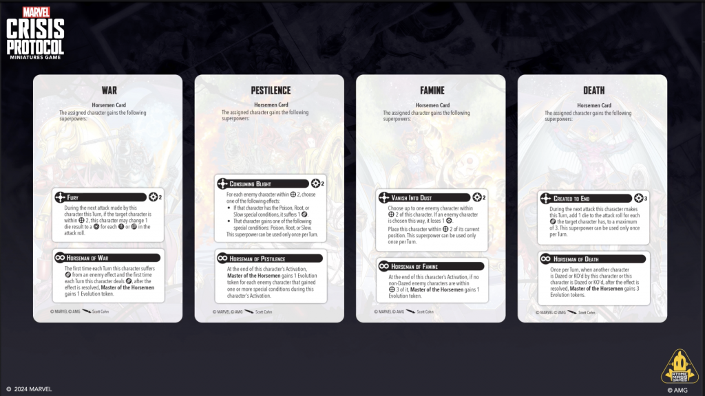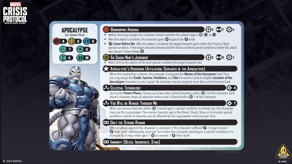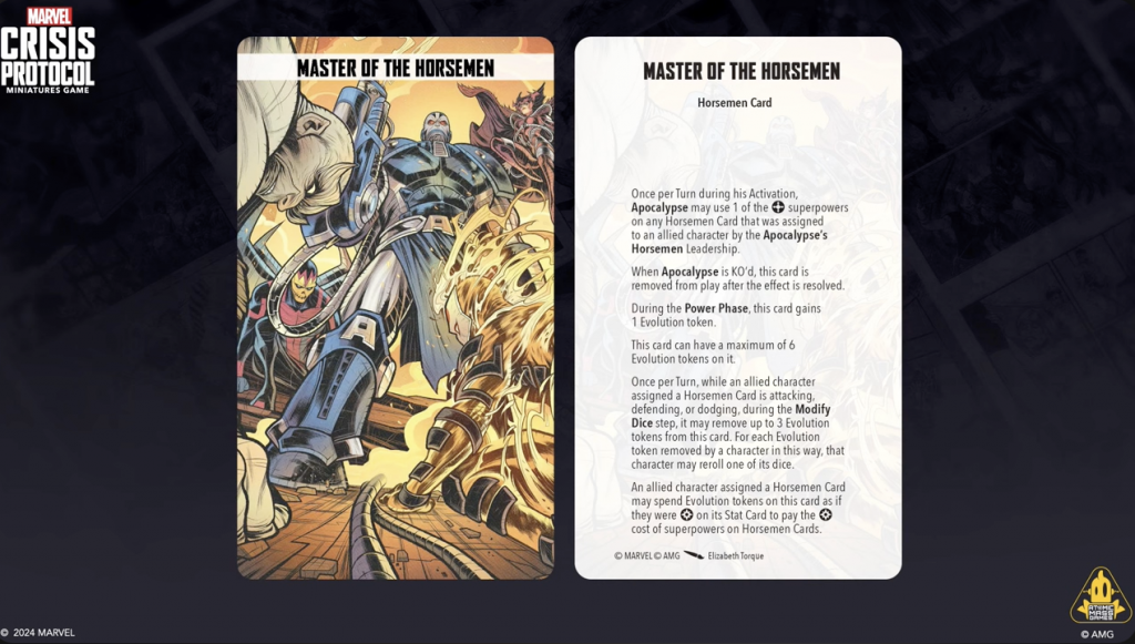 This was the big one of Day 1 for MCP. Both Will Pagani and Will Schick teased in an episode of the Strike Better podcast that they were going to reveal a ton of information about Apocalypse, and boy did they deliver. Apocalypse will have his own affiliation (Servants of Apocalypse), and a unique mechanic (Master of the Horsemen) that goes along with his leadership with his Four Horsemen. They also revealed and discussed the new Ultimate Encounter that will come with Apocalypse.