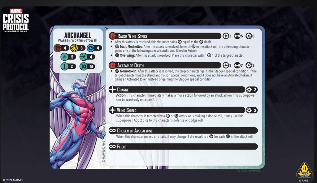 The panel revealed the healthy side of one of Apocalypse’s more famous horsemen: Archangel. He looks like a fun way to hand out conditions and activated tokens to opponents.