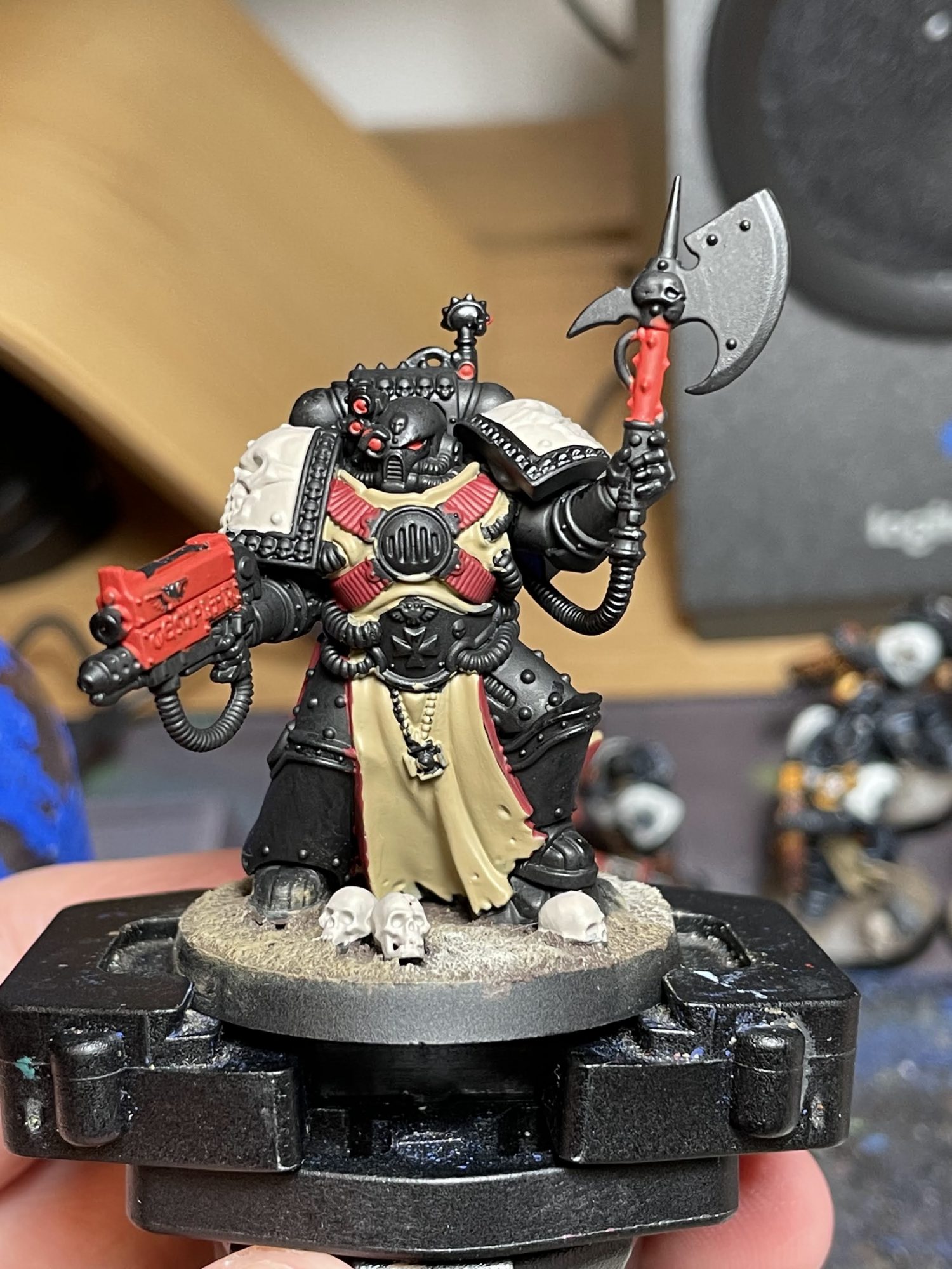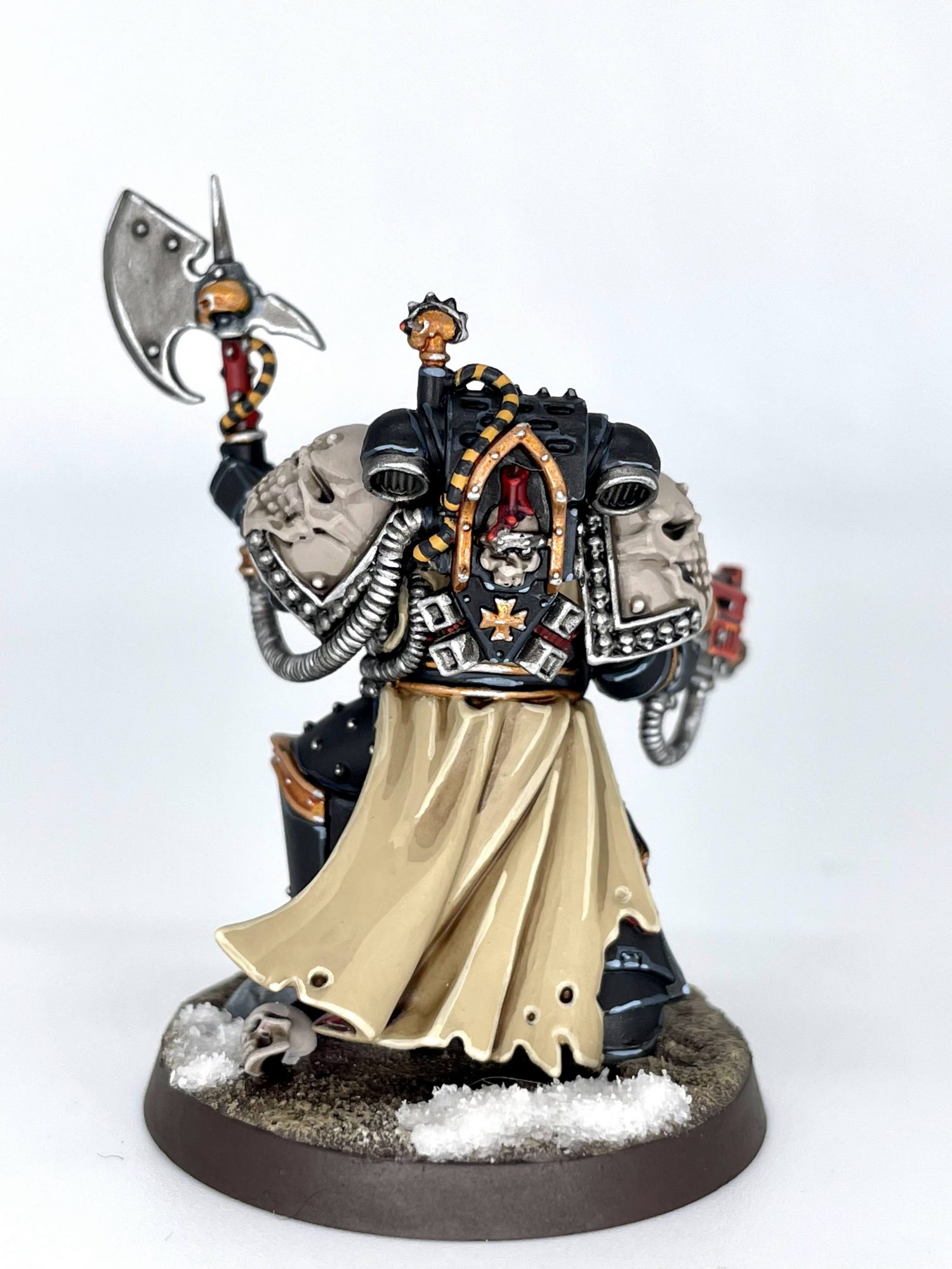 His helmet also uses a pretty standard Marine head connection, so you could swap it out for something else. You could easily swap in a skull helm and convert his axe into a crozius and make a killer chaplain, for instance.