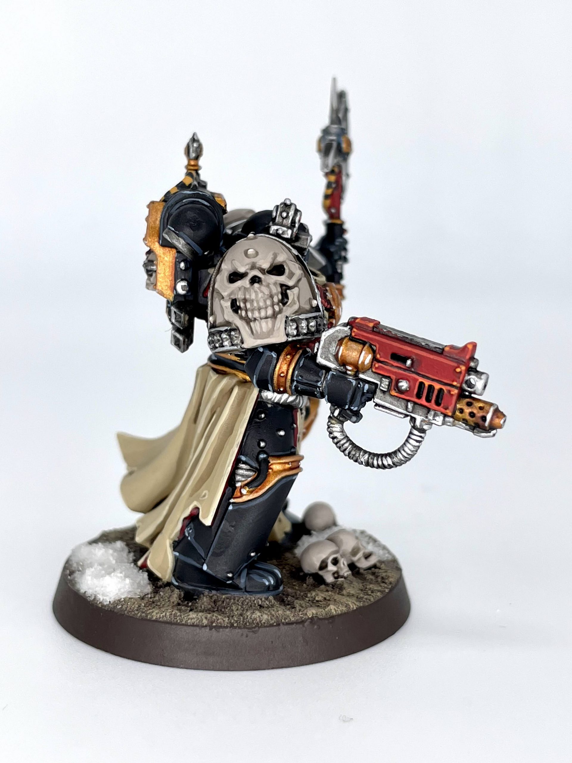 His details are deep enough to really take washes well, so I recess shaded every surface, except the metallics which I hit all over. The shoulderpads got a 1:1:1 mix of Agrax Earthshade, Nuln Oil, and Lahmian Medium, before a 1:1 mix of Agrax Earthshade just in the deepest details - the border around the trim and the eyesockets, nose, and sides of the mouth on the skull. I used that same 1:1 mix for the interior of the cloak to give it depth and warmth. I shaded the tabbard exterior with Agrax Earthshade, the dark red straps on his chest with Nuln Oil, then all gold with Reikland Fleshshade and all silver with Nuln Oil. On the flamer barrel I used a Druchii Violet wash and then hit the nozzle end with a 1:1 mix of Agrax Earthshade and Nuln Oil. I also used a smidge of old Guilliman Blue glaze around the skull on the power axe to give it a neat glow. You could use Tallasar Blue Contrast paint for this too.
