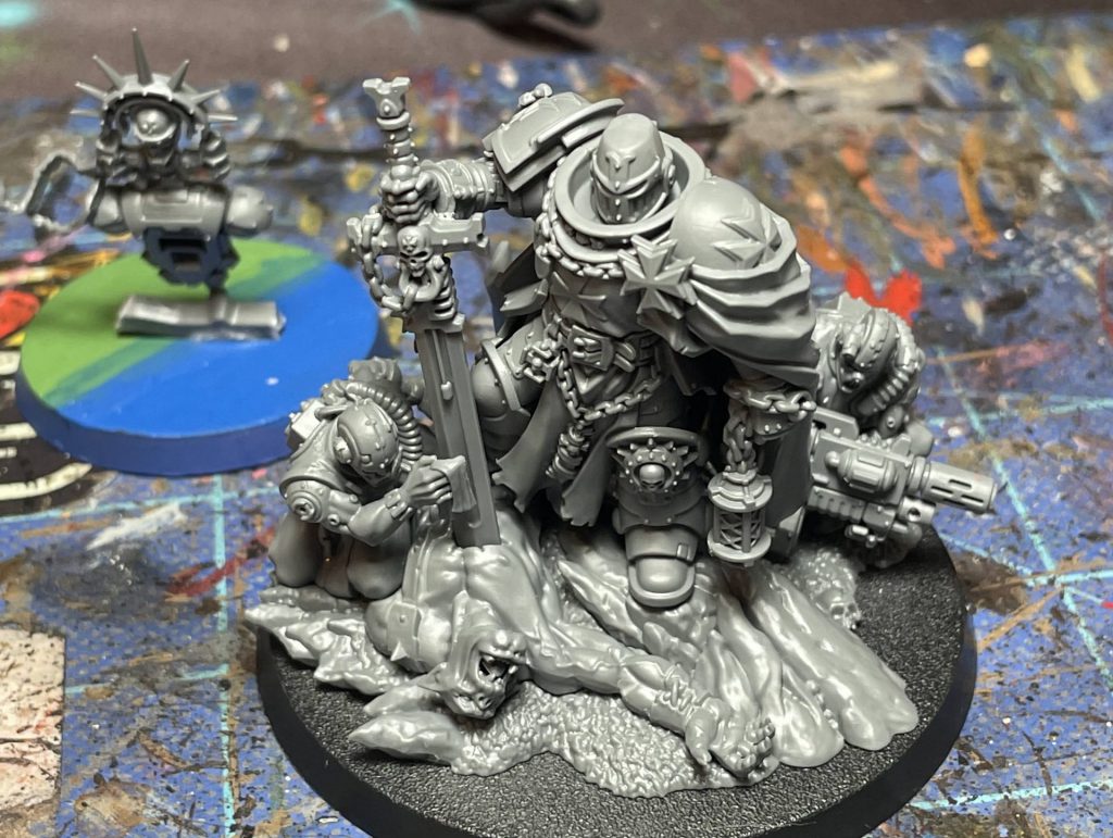 The trio of personalities themselves all go together more or less how you would expect a modern plastic character to fit. The base has little pegs and footholds for everything to go on, so they arrange themselves in diorama-like order easily. One sprue has large friend Helbrecht while the other has the basing materials and attendant weirdos. There are some odd fits here, with a pair of flat joins without guide pegs being the only way to attach the various pieces. This isn't a problem with your general rifle arm on an Intercessor, but with a character this intricate, it can be slightly unnerving. As a result, when I built large friend Helbrecht his sword was at the wrong angle, though forcing him into correct placement by arranging him on the base was not hard. There's also a tough gap on his cloak which will take some finagling to fit flush.