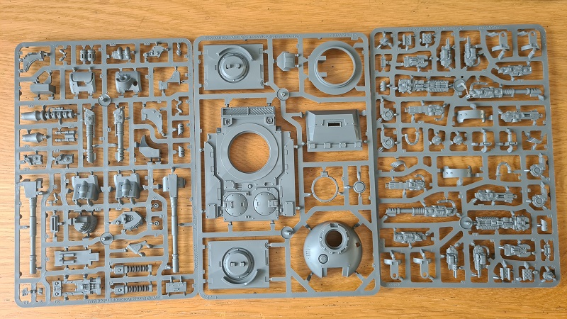 On top, you get a choice of main guns, but not an exhaustive one. On this sprue you get the Predator cannon, volkite macro-saker, twin Gravis lascannon, and graviton cannon, and that's your lot. No sign of the magna-melta cannon, flamestorm cannon, executioner plasma destroyer, heavy conversion beam cannon, or neutron blaster. Presumably these will be along in another kit later down the line, a bit like the Leman Russ Battle Tank/Leman Russ Demolisher situation in 40k, or perhaps they'll continue to only exist in resin form. Personally, I plumped for the classic "all the lascannons" approach, with las sponsons and twin Gravis las on the turret; if I'm going to run this thing it's going to sit at the back spitting lascannon fire at things and hoping everyone has bigger Contemptor-shaped problems to deal with.