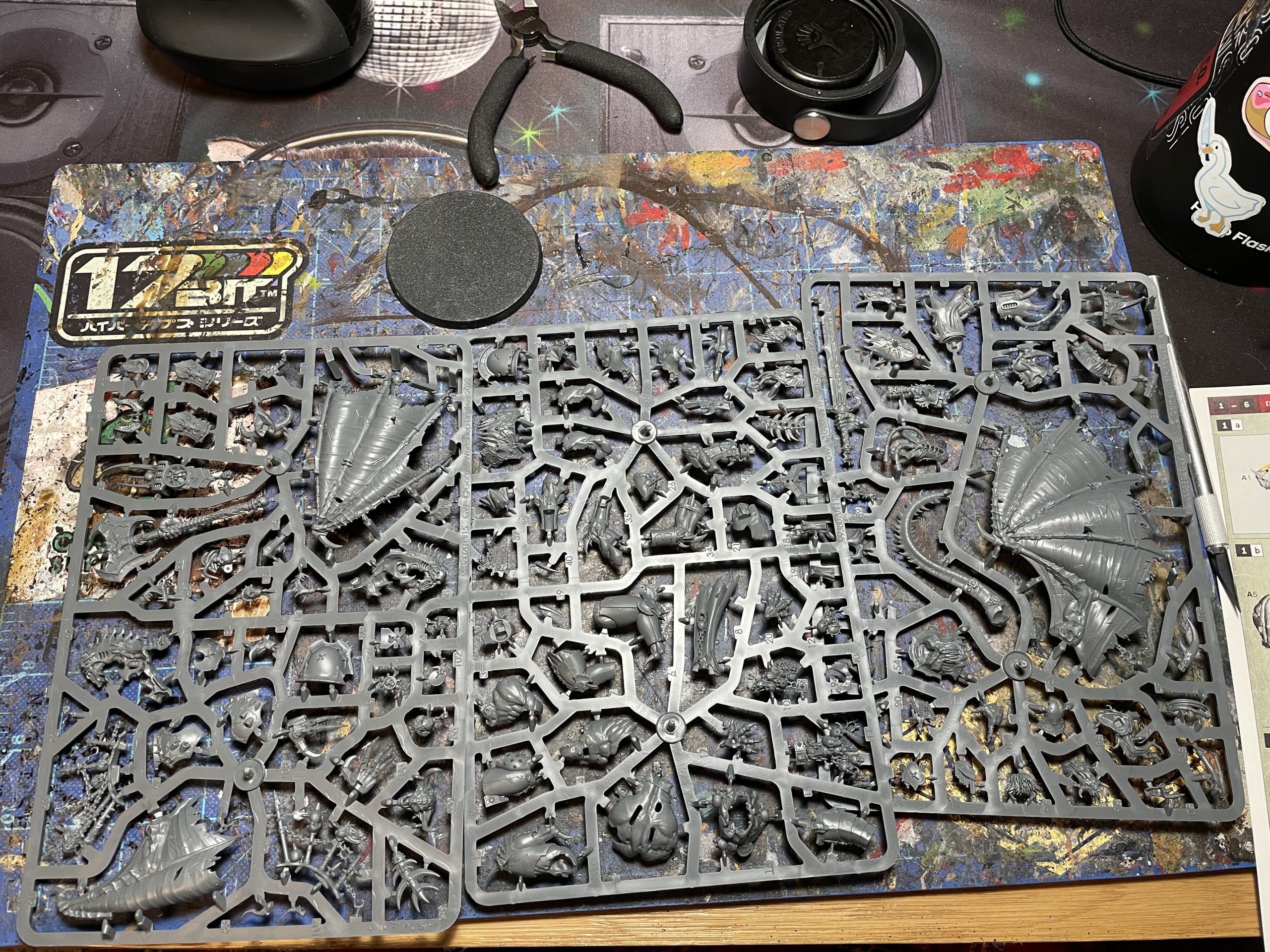 There are so, so many pieces to this model, and the sprues are packed so tightly it can be tricky to get a pair of clippers in there. Said sprues are positively packed, and whatever devil's bargain was made to fit all these bits on 3 small sprues had some drawbacks as well. In a move that is fairly rare in today's Citadel miniatures, the bits are scattered across the sprues in a nonlinear fashion. You may need two adjacently numbered pieces for a hand or foot or something, only to have to hunt them down and find which sprue has which piece in the sequence - so bit 17 might be on sprue A, but 18 might be on sprue C. Searching for the specific bit I needed definitely contributed to the construction time on this miniature, as pieces are typically laid out next to each other on kits not quite so packed as this one.