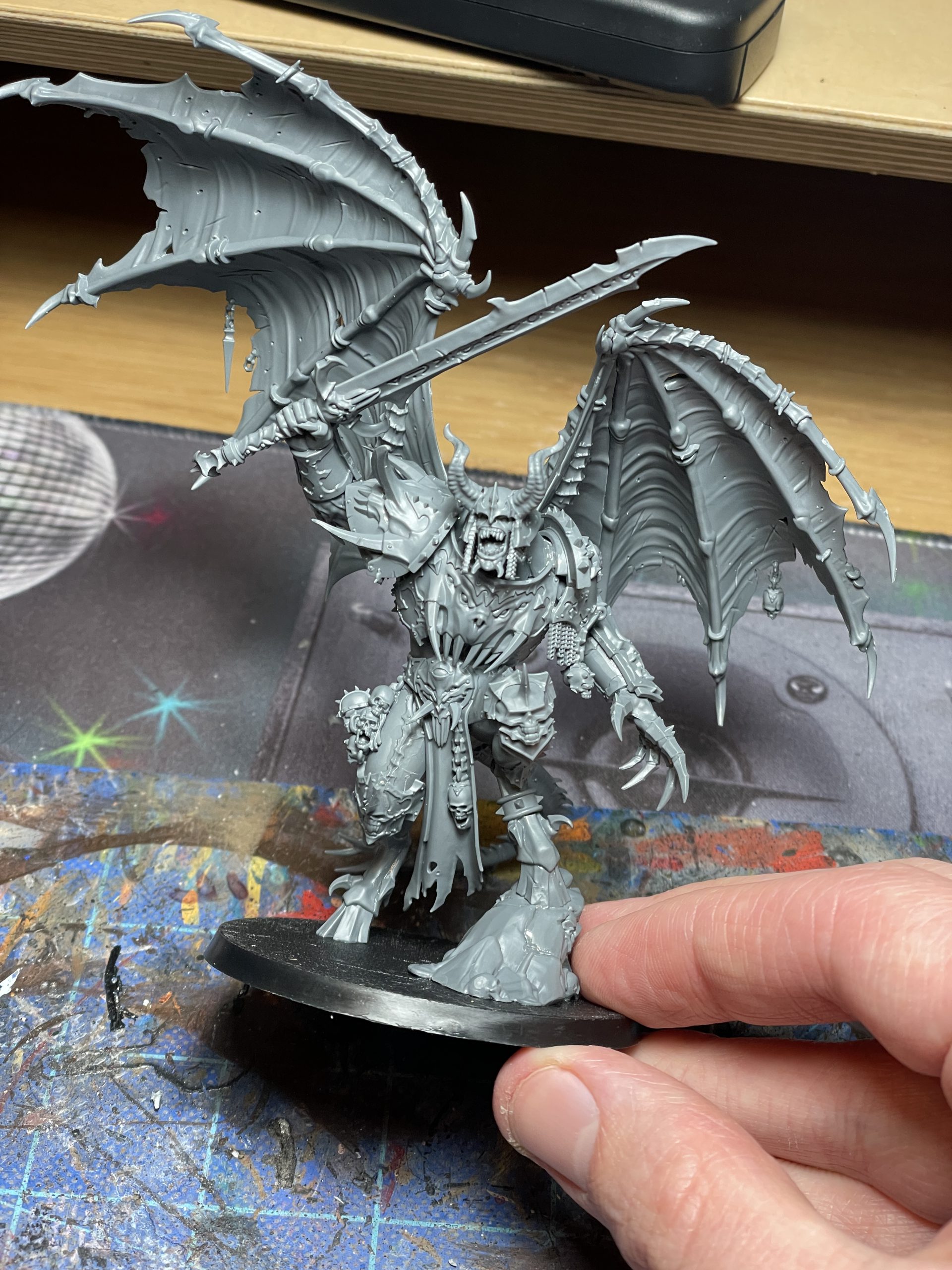 As I was building and painting this model, I had a lot of flashbacks to working on Be'Lakor. In a lot of ways, it feels like a model of Be'Lakor's stature scaled down about 30% with everything that may entail: fiddlier pieces, tinier details, but a less intimidating model overall. Even many of the details - the weird hanging triangle shaped piece of metal, the chains, and the piercings in his wings - all evoke Be'Lakor before him.
