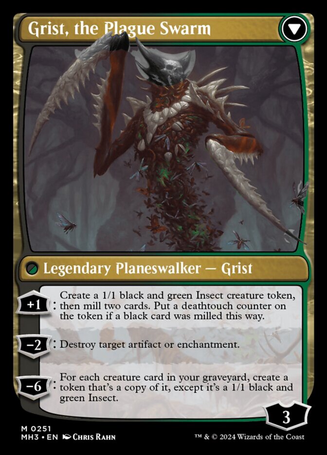 BPhillipYork: So the -6 is huge, but there's no easy way to turbo that out. This seems like the worst of the transforming planeswalkers since it doesn't really do anything until you transform it, and even then it's kind of meh. But it's a 1 cost that you can turn into a planeswalker that mills and generates Insect tokens.