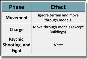 ‘If the datasheet for a model says it can Fly, then during the Movement phase it can move across models as if they were not there, and when moving across terrain features, vertical distance is not counted against the total it can move (i.e. moving vertically is free for this model in the Movement phase). If the datasheet for a model says it can Fly, then during the Charge phase it can move across models (other than Buildings) as if they were not there. [Core Rules FAQ Pg1]