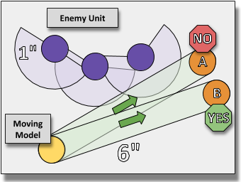 Models need to move around as shown and can’t just casually stroll past the enemy as if they weren’t there. In the diagram above the model can’t move to position A because it would pass too close to the enemy unit. You don’t have to move in a straight line like in this example though, so you could find a position closer to A if you wanted by moving around.