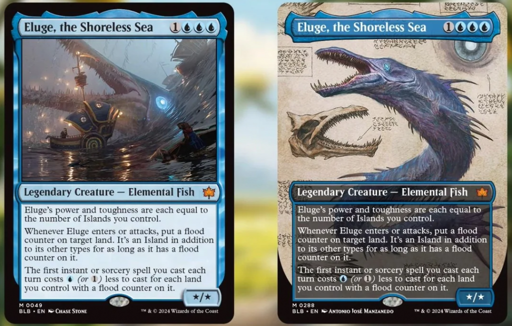 Eluge, the Shoreless Sea, one of the Commanders with the subtlest 'wow' factor they've printed in quite some time. Eluge has some trinket text about its strength scaling with the number of Islands you have, but the meat of its power comes through that final line: "The first instant or sorcery spell you cast each turn costs {U} (or {1}) less to cast for each land you control with a flood counter on it." It might not seem like it, but much akin to Liara back when she was printed in 2022, this is actually unique text, being the first instance of both colored and colorless mana being discount-able in the same effect. The reason for this effect's strength should be apparent