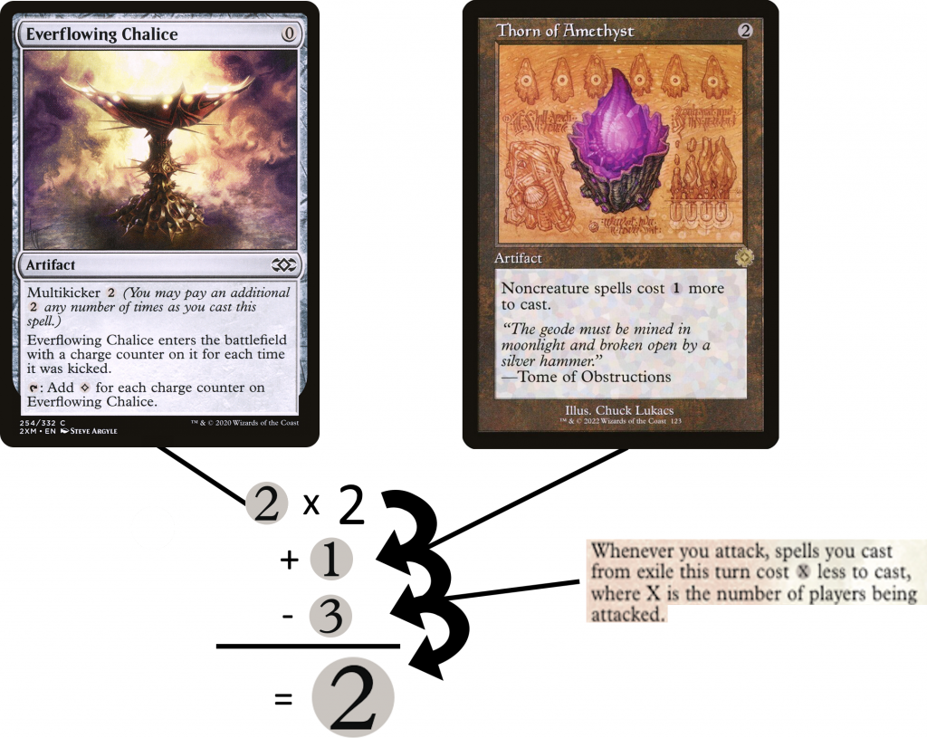 — and attempted to cast Everflowing Chalice, kicked twice, the cost would be tabulated as follows.