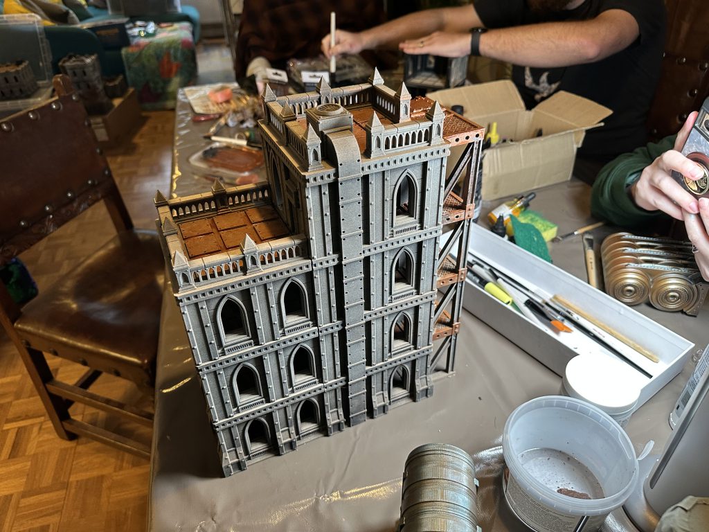 As much as possible was primed before the first big day, so that we could test some approaches and agree how the base coats would be put down. Using rattle cans to get the majority of the colour on massively speeds the whole process up, and I started by applying a mid to high zenithal across the whole structure, leaving only the lowest quarter and deepest recesses black. Ideally I would’ve primed brown for this as I feel it’d give a better graduation to shadow, but Colour Forge was out of stock so black is what we settled on.