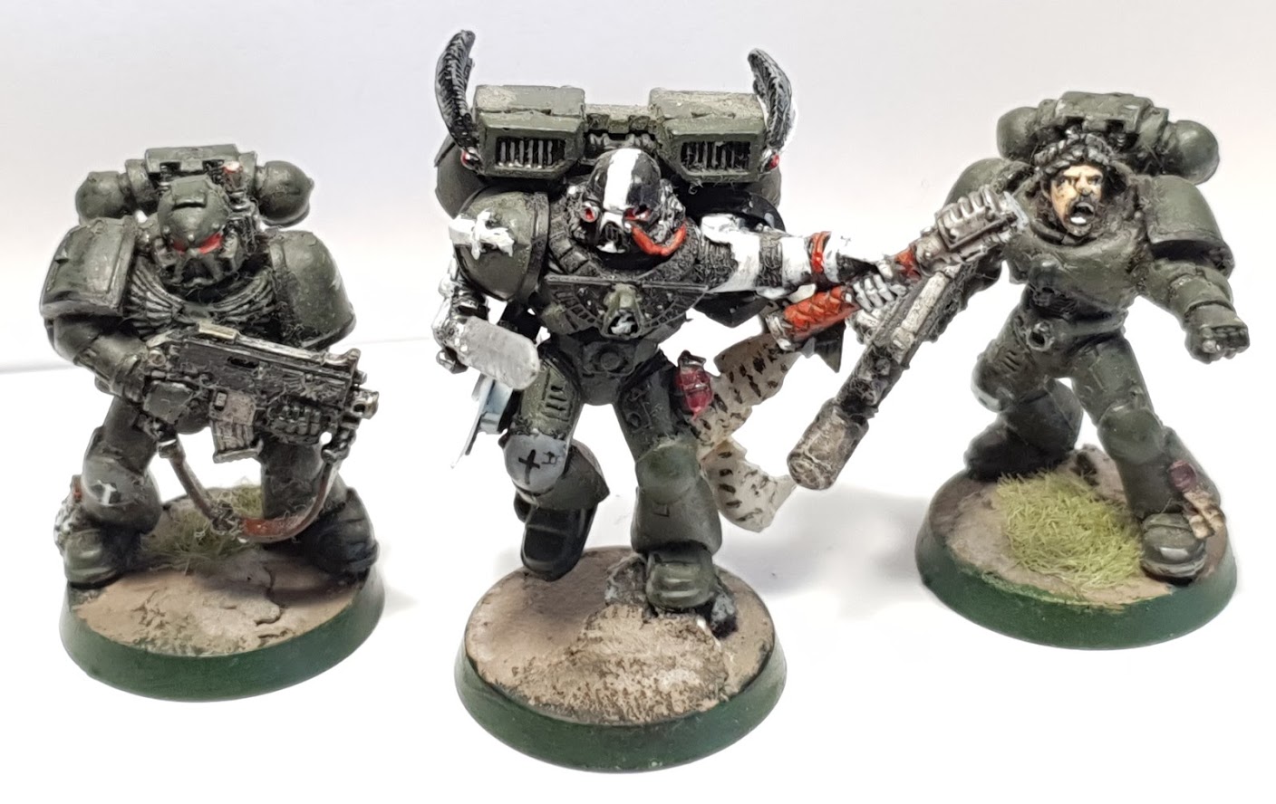 Compare the two pictures and try to ignore the (hopefully) vast improvement in painting. See how the black grey/greens are all blurring together compared with white trim details on the marines above? This is something that I wanted to avoid on the MKII version of the Swords.