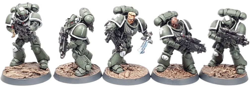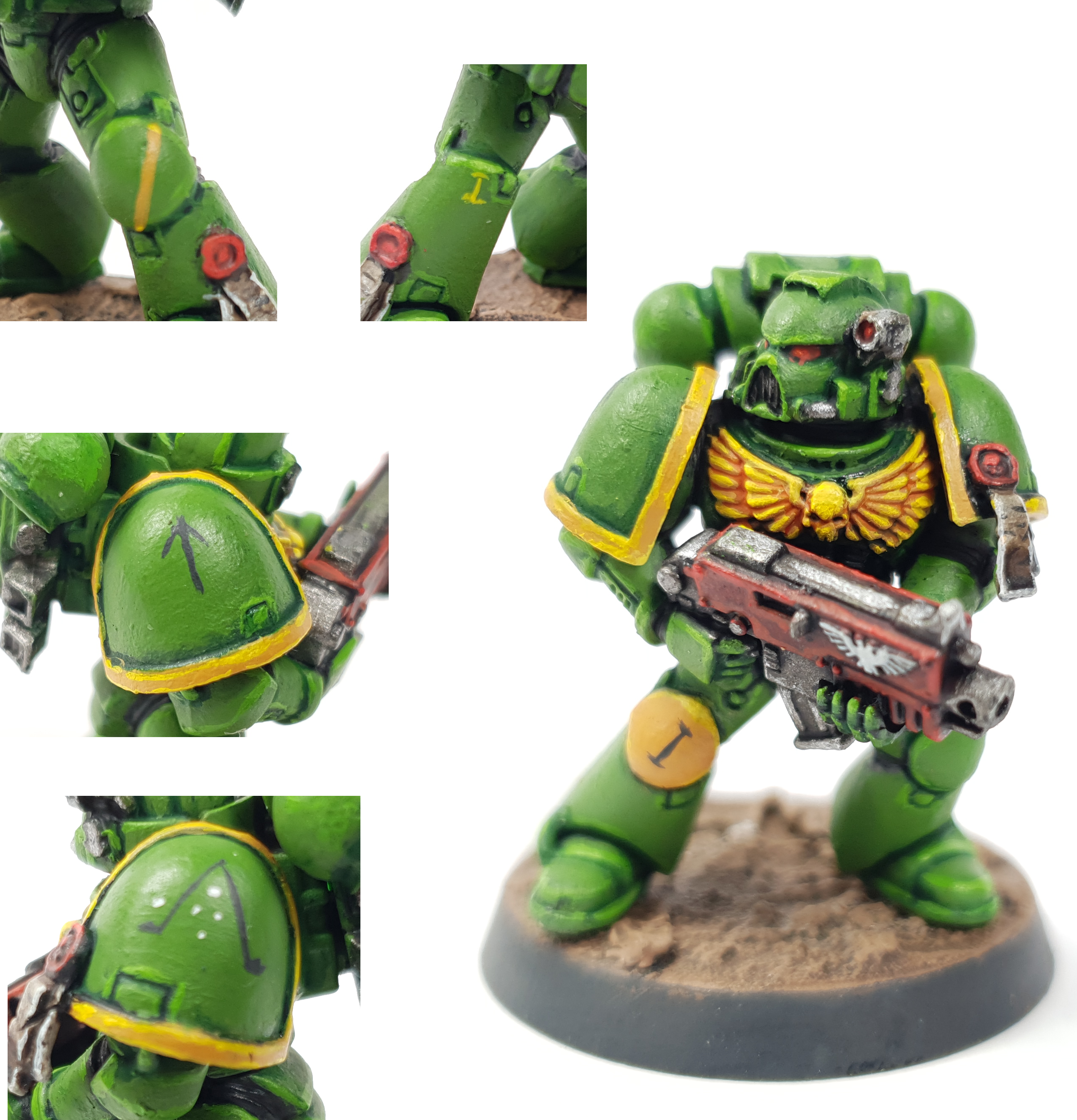 what if Australia and the 2000 Olympics, but space marines." and for now clocks in at a massive 5 models. However look at the narrative detail on them. I've warped the tactical marking to be Broad Arrow, which is frequently used in military moto shirts in Australia, while the chapter logo is a stylised Australian flag with a Greek Lamba. Finally I have a company and squad marking on the kneepad and a way of showing demi squad leaders. With this I've got a strong start to play around with if I choose to expand the chapter in the future.