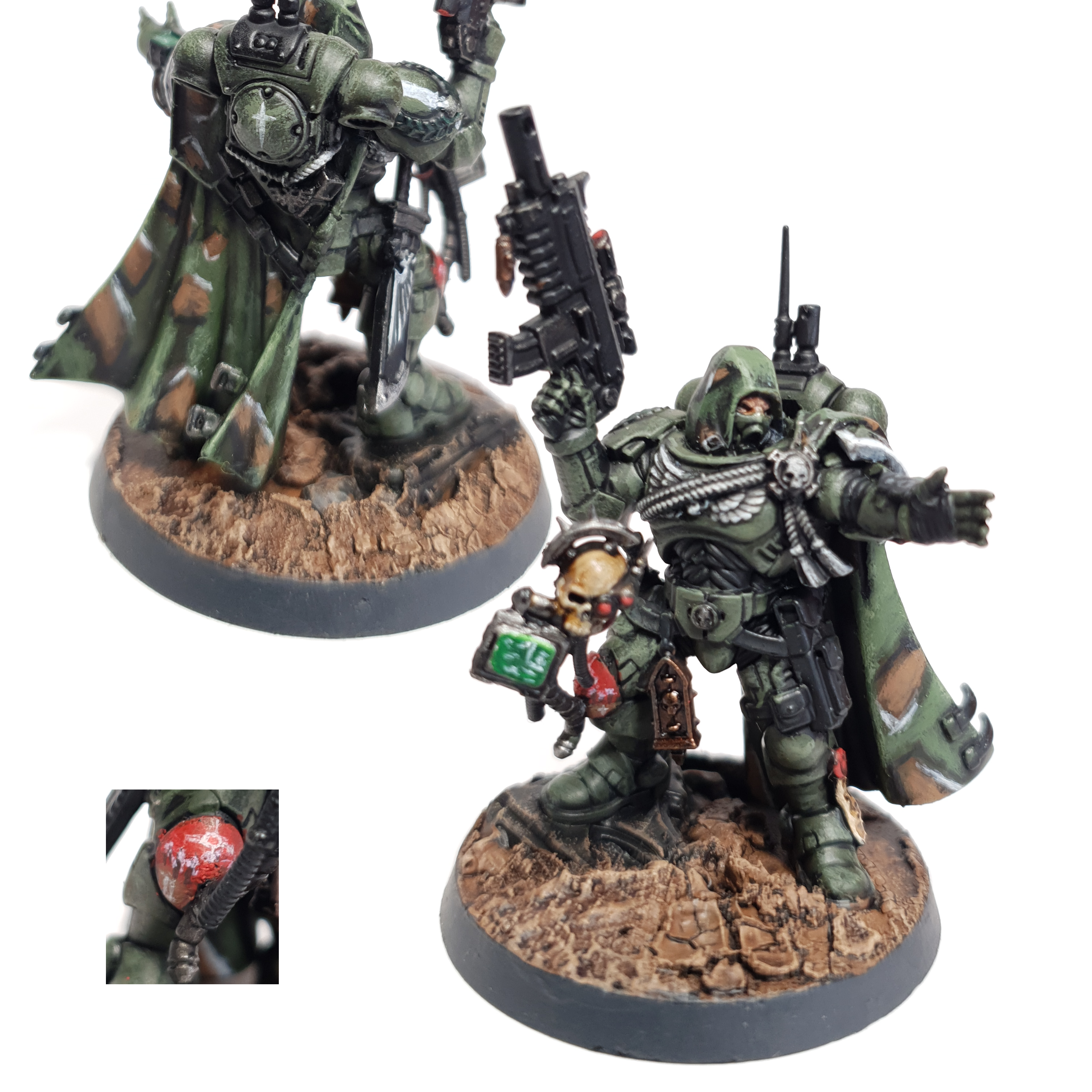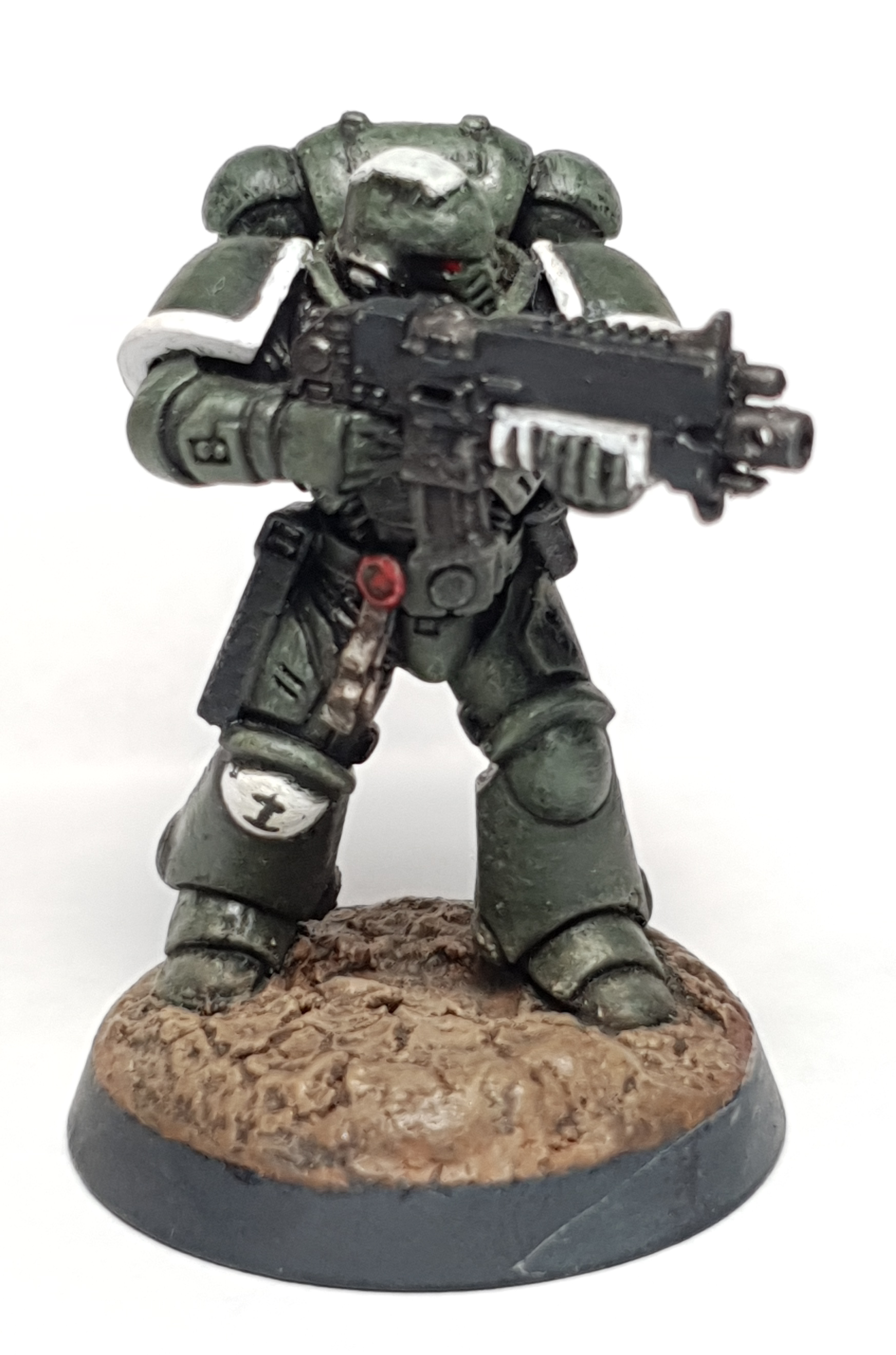 So I put my thinking cap on and painted up a number of test models, trying out various trim colours of red, black and grey, while also exploring the new Primaris sculpts. White ended up being forerunner, I also found that the distinctive crest/ears part of the helm could be picked out in white to get a call back to ancient troops, like roman legionaries or knight's crests. I also started figuring out how to show what company the troops came from and where squad markings would be present. Given that the white helm/trim really made the green 'pop' I needed to keep that in, so therefore I went with the right knee pad. I also spent time figuring out how to show squad leaders, veterans and the like and turned to the codex for ideas. I ended up coming up with a quick system based on the helms.
