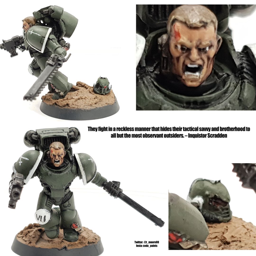 It was also lucky that The Pure's scheme worked with the bases. Going back to key details, the chapter marking of The Pure was a key detail I had to nail to make the force work. I had to come up with a freehand design that wouldn't send me insane while painting it, a simple S and a blue dot and boom. Something not great but serviceable enough. Also note the Kopesh, a weapon mentioned in their use in the book. By Tyler "Coda" Moore