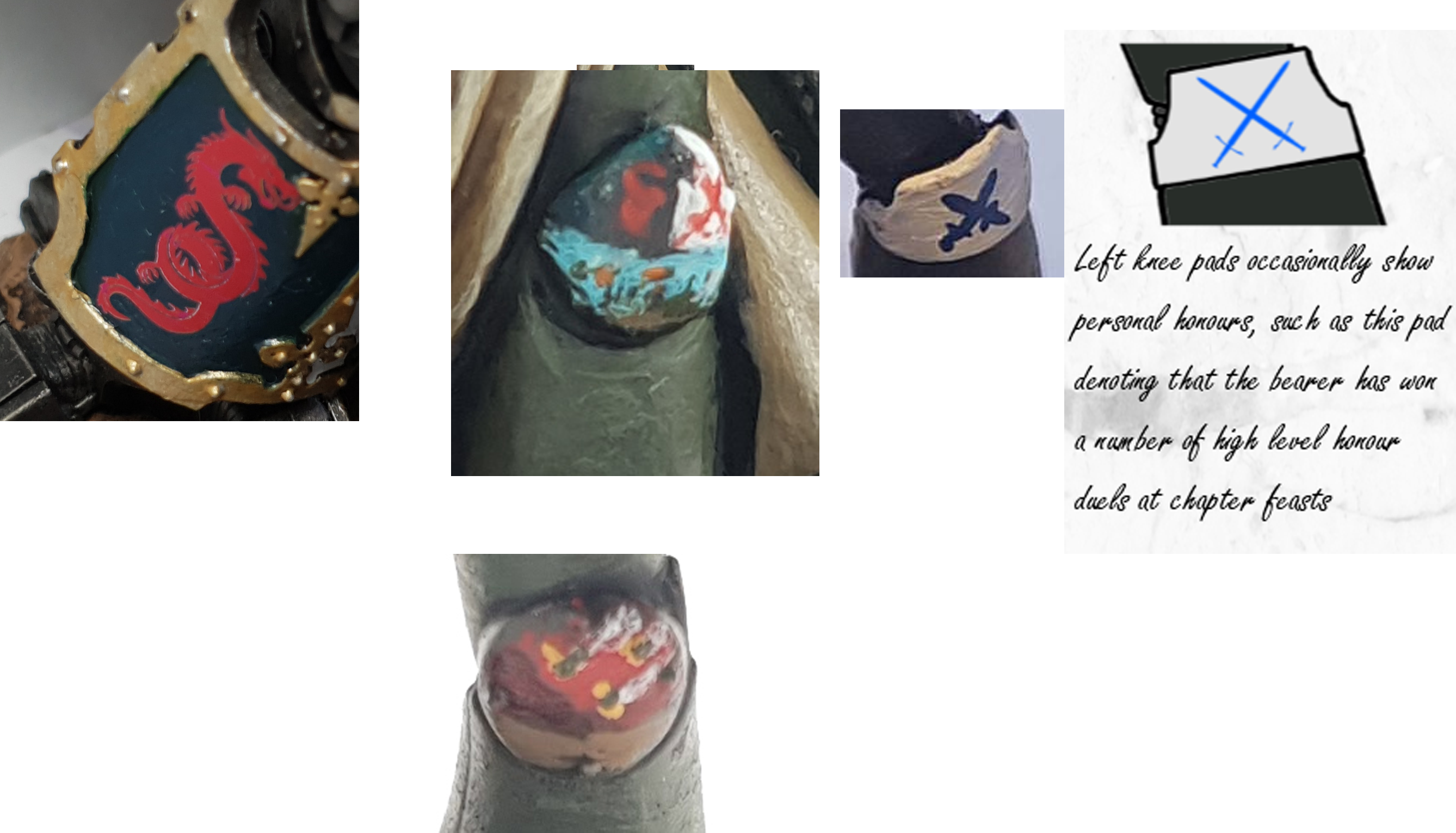 I use the kneepads on my swords as a key feature to show heraldry as well as squad and honour markings. See how I've linked my Chapter Master's Kneepad to my tactical squad sergeant, vanguard veterans honour mark and my imperial knight.