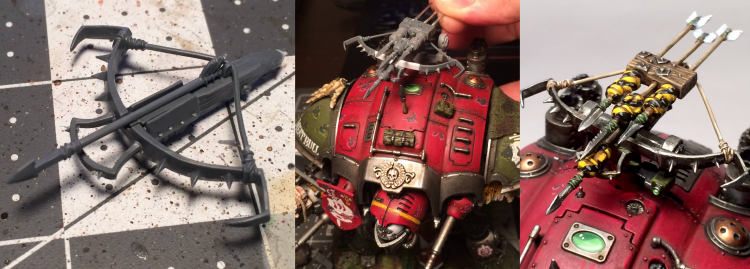 After doing a commission with the Stonetusk/Frosthorn kit years ago, the leftover Ogre crossbow impressed me with its size and savagery and I wanted to find a way to use it. Years later, the idea of making it into a Knight-mounted ballista inspired me to convert a Stormspear Rocket Pod for my feral Imperial Knight, Carno Taurus.