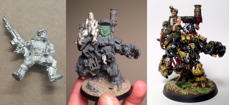 When SRM passed me a metal Catachan tank rider, I placed it on my desk next to the Ambot conversions in progress. After playfully balancing the rider atop an Ambot, the idea for an Ambot-riding field mechanic was born. The resulting model, Lt. Hartigan atop Scruntbot, was inspired by that single metal bit and now serves as a Lieutenant with custom rules in our local campaign.