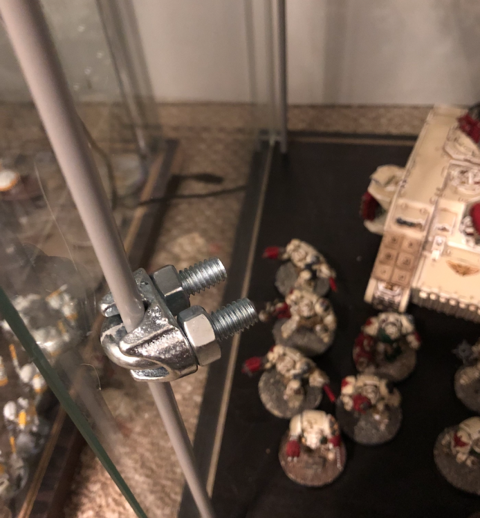 - Screw the clips on, hand-tightening until you have them all at the same level, and then tighten with a wrench or pliers. You're putting your models on here, so you want them to be really honked down on there, but you also don't need to go crazy, because a square foot of warhams isn't that heavy. I put the clips in at about a 45 degree angle, facing toward the center of the case. I found this worked better with the corners and the door, and the angle allows for some leeway if you got the cuts wrong. This part isn't super fun, but trust me, it gets worse.