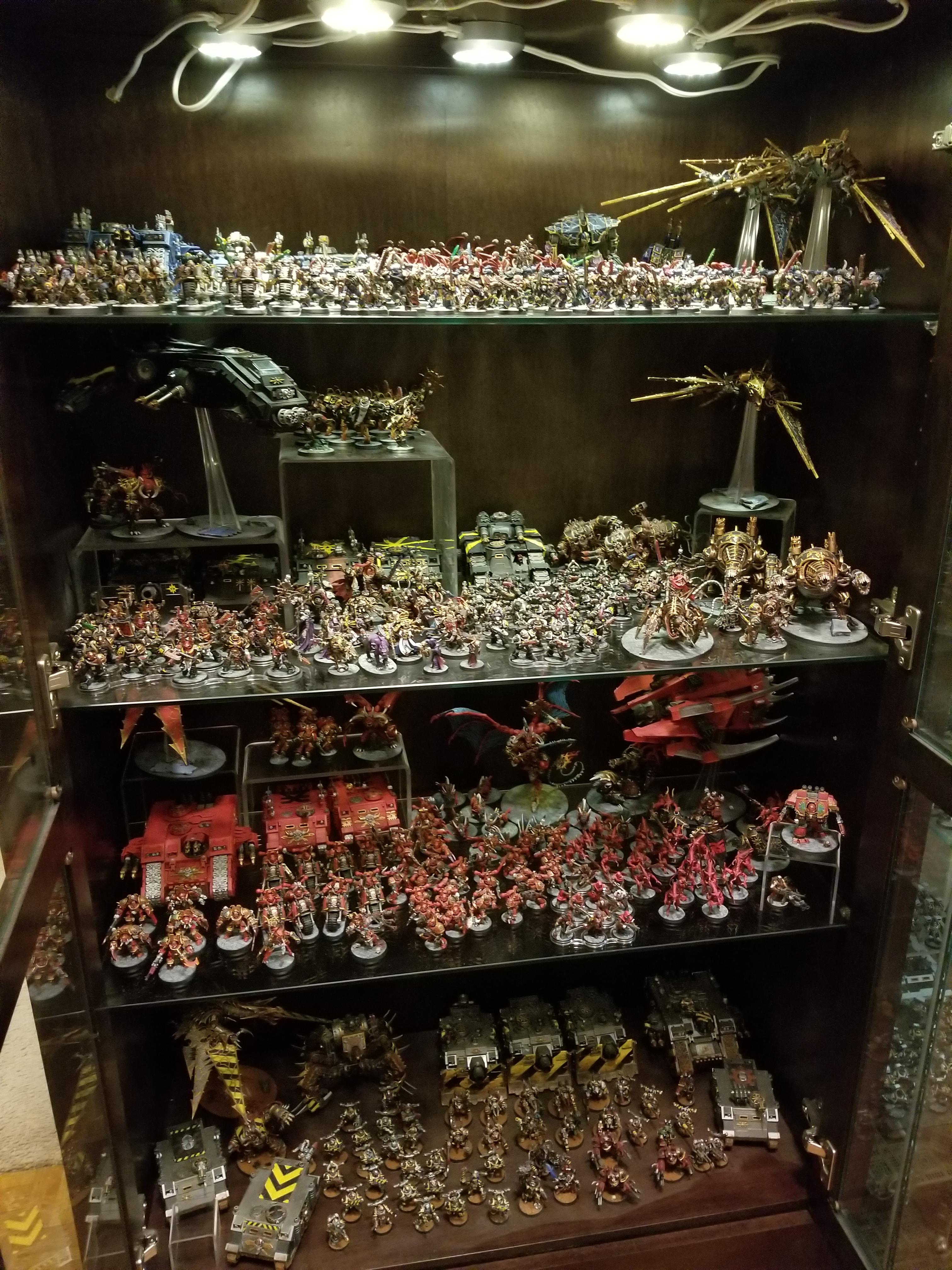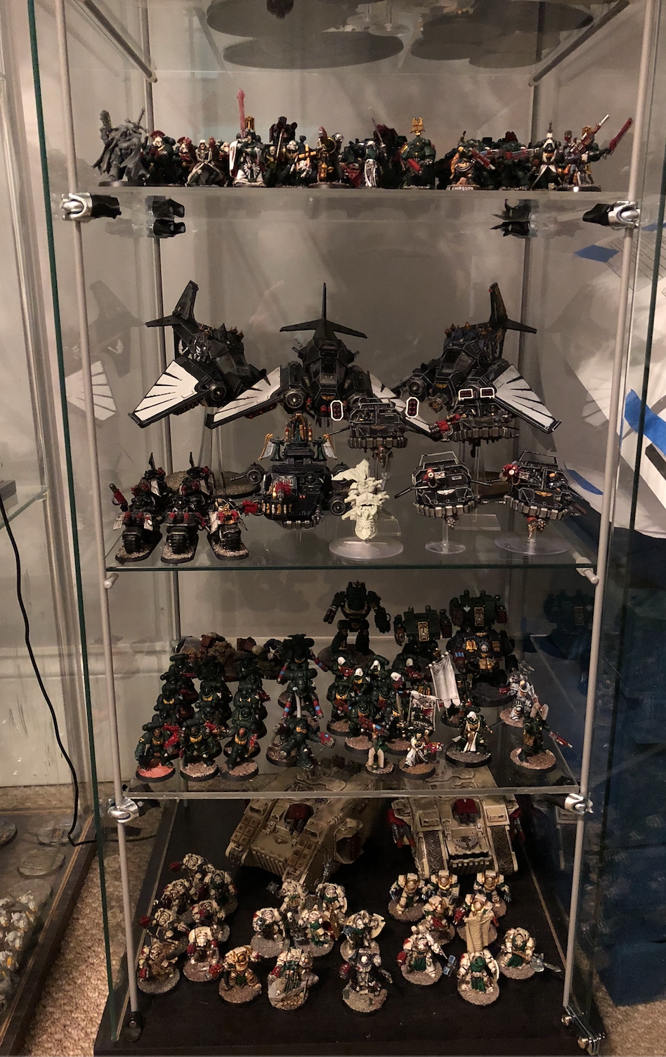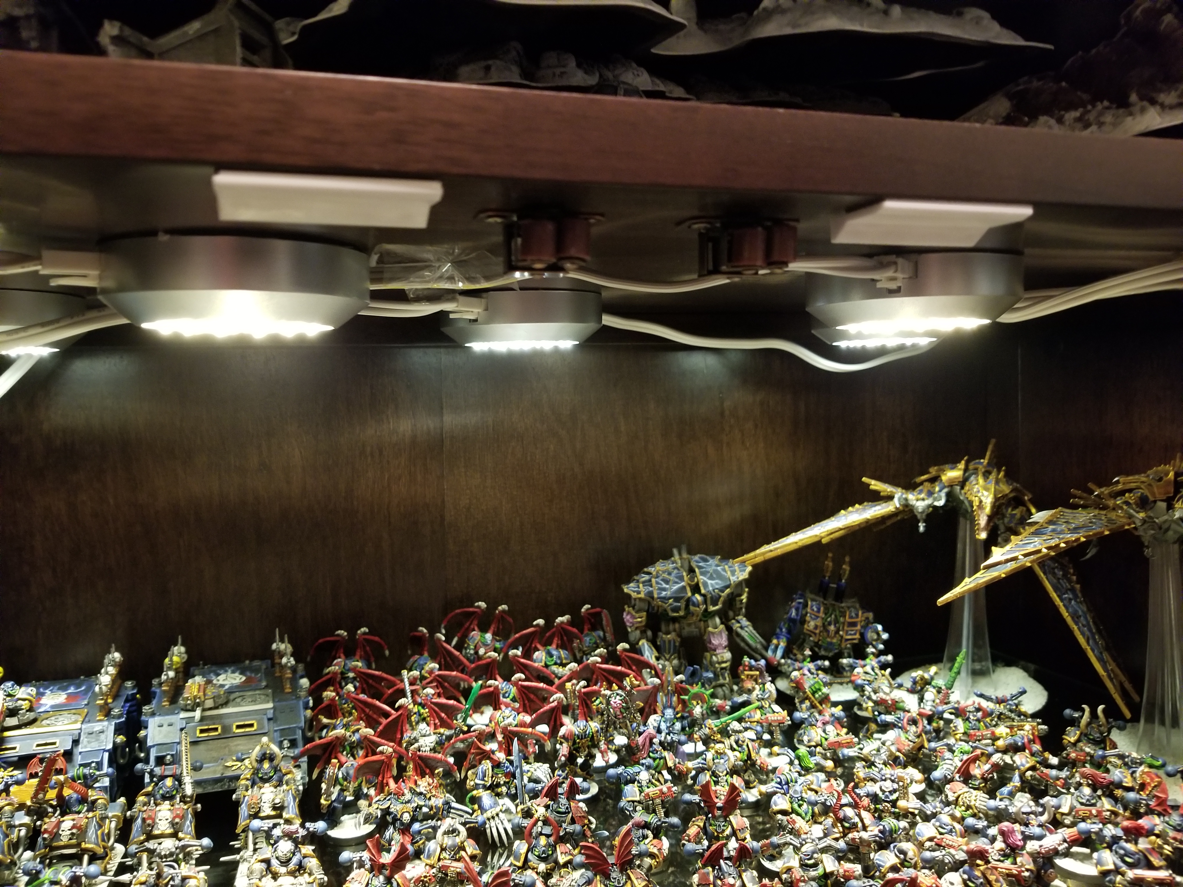 The lights were easy to install (I just screwed in the mounts to the underside of the case's top), and they really do add a lot to the overall effect. The only downside is that the more you put on the upper shelves, the less light makes it down to the bottom shelf. Which is why I put my Iron Warriors down there. Both because they're my worst-painted army overall, and because it's fitting narratively for them. At some point I realized I'd need more space on my shelves and I was wasting a ton of vertical space, so I spoke to Greg and he recommended plastic jeweler's case riser inserts, which gave me cool platforms to put flyers and jump infantry on, clearing up more space for other models. I tend to organize my armies on the shelf with the main warlord in the middle, the troops up front, and large tanks and war machines to the sides and back, since they'll naturally sit higher and be visible over the rank-and-file models anyways.