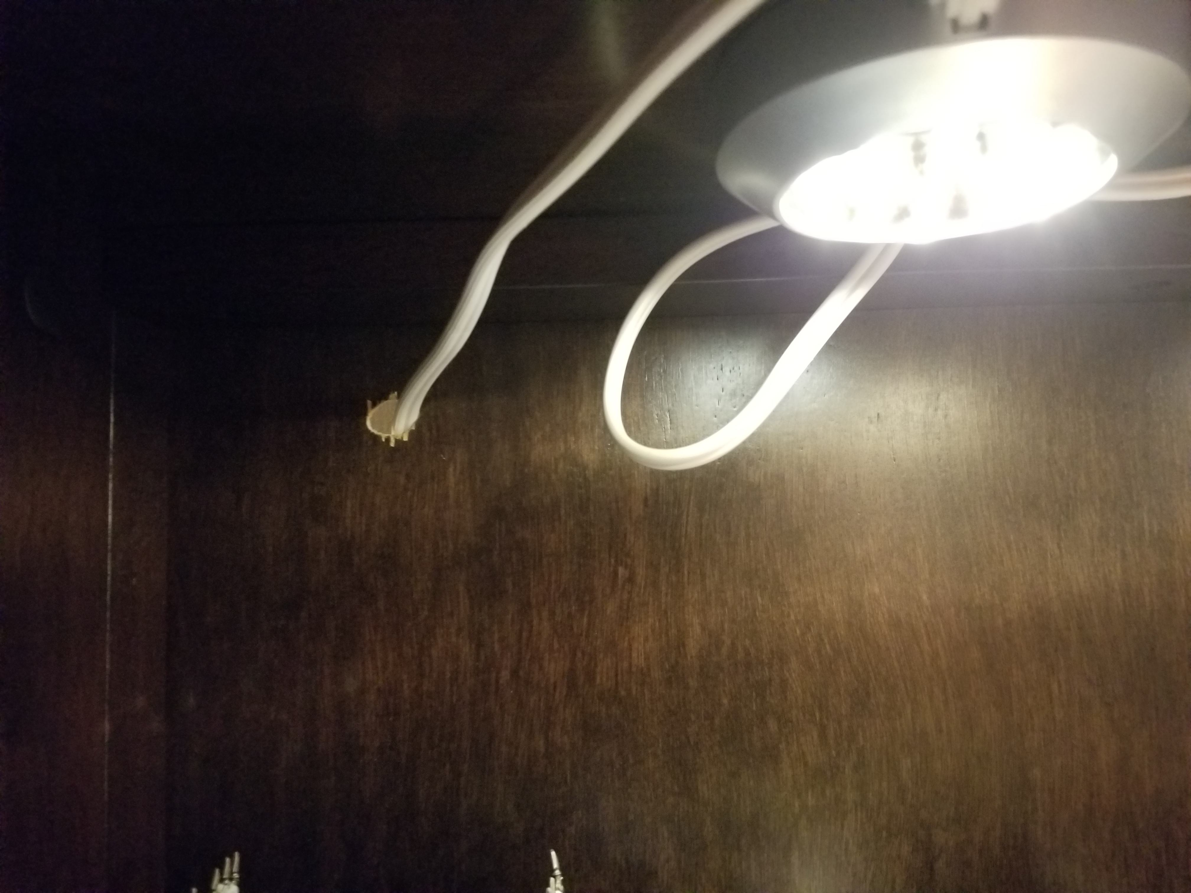 If you spent any time on the cabinet's product page, you may notice that it does not come with built-in lighting. About two hours after I had assembled the cabinet and put minis in it, I found myself saying "shit, this needs lights." And so my plan to just have a cabinet turned into a hobby project all its own. If I were doing this today, I'd probably install lighting strips, which are easier and more effective. But I was (and remain) an idiot, so instead I installed LED cabinet lights that I ordered off of LightingDirect.com. They serve the purpose well and I was able to install 5 out of the 6 I ordered pretty easily, then drilled a hole in the back of the cabinet to run the cable for them through. Sadly, they're starting to dim a bit so I may be ordering new ones soon, but they've run very well over the past seven years.