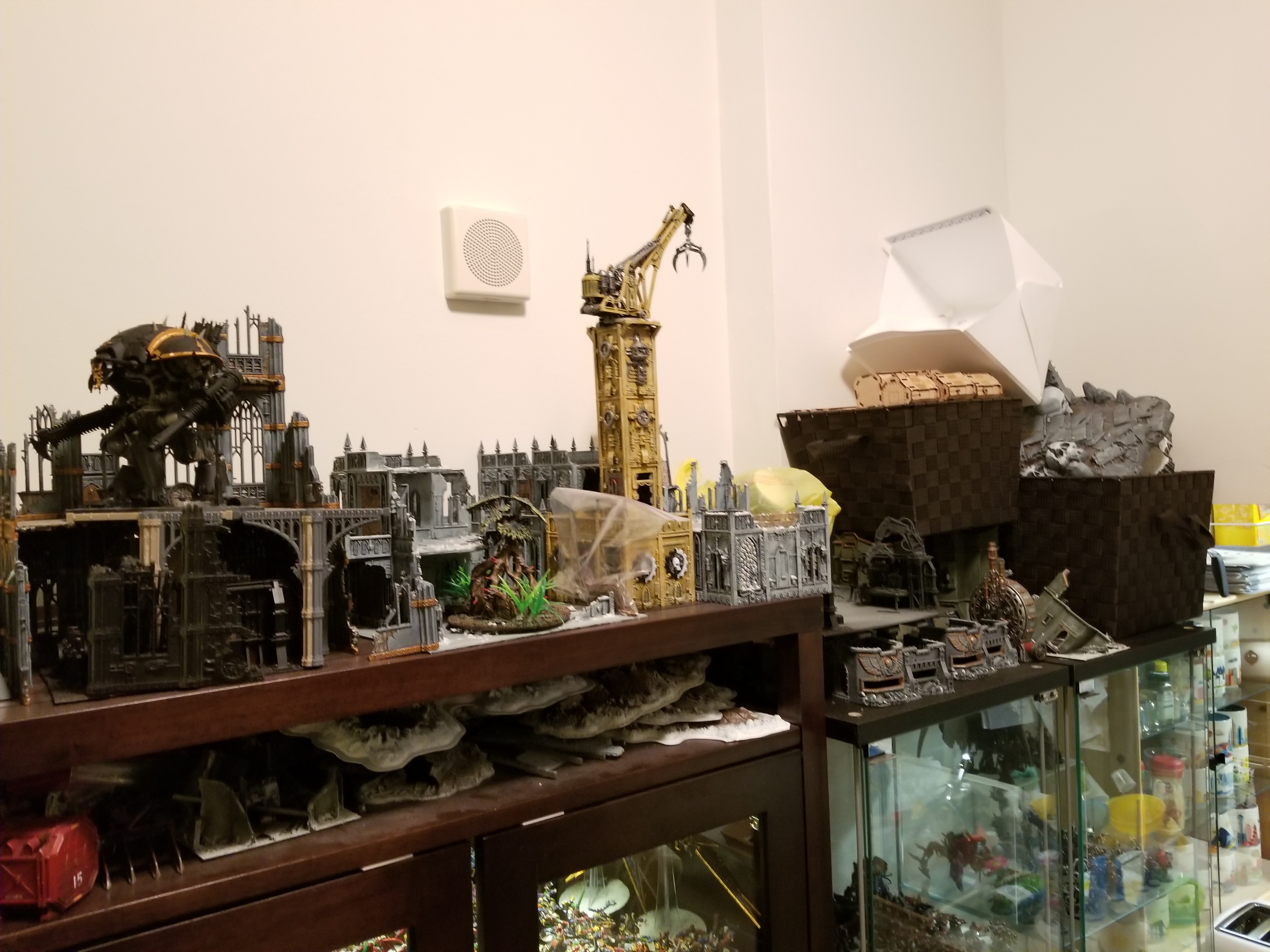 Like Greg, I live in a densely populated area. Unlike Greg, I live in a thriving city with rising property values and real mass transit, so buying a house that fits my family's needs isn't really within our (admittedly, considerable) financial means. So most of my hobby storage and display solutions are based around how I can do things with limited space. I decided early on that I wanted to have a display case for my space barbies, both because I am proud of how well painted they are and because it makes it way easier and faster to get them set up for games (and put away after). Fortunately for me, my wife is also a nerd and just all-around-excellent, and has been on board with my hobby from the beginning, except for the part where I have shitloads of unpainted miniatures and keep buying more. But the important thing is, we're both OK with letting everyone know that I'm a huge nerd, so I not only have display cases, I keep them in our main room/dining area, where anyone coming over will see them. In my experience it's rare that someone will give me grief about them and even if they do, I stopped having anything approaching "shame" long ago. Usually the conversations turn to questions about how I painted my sweet, sweet minis.