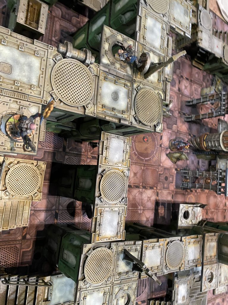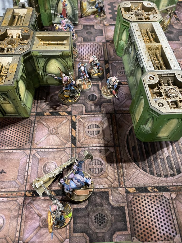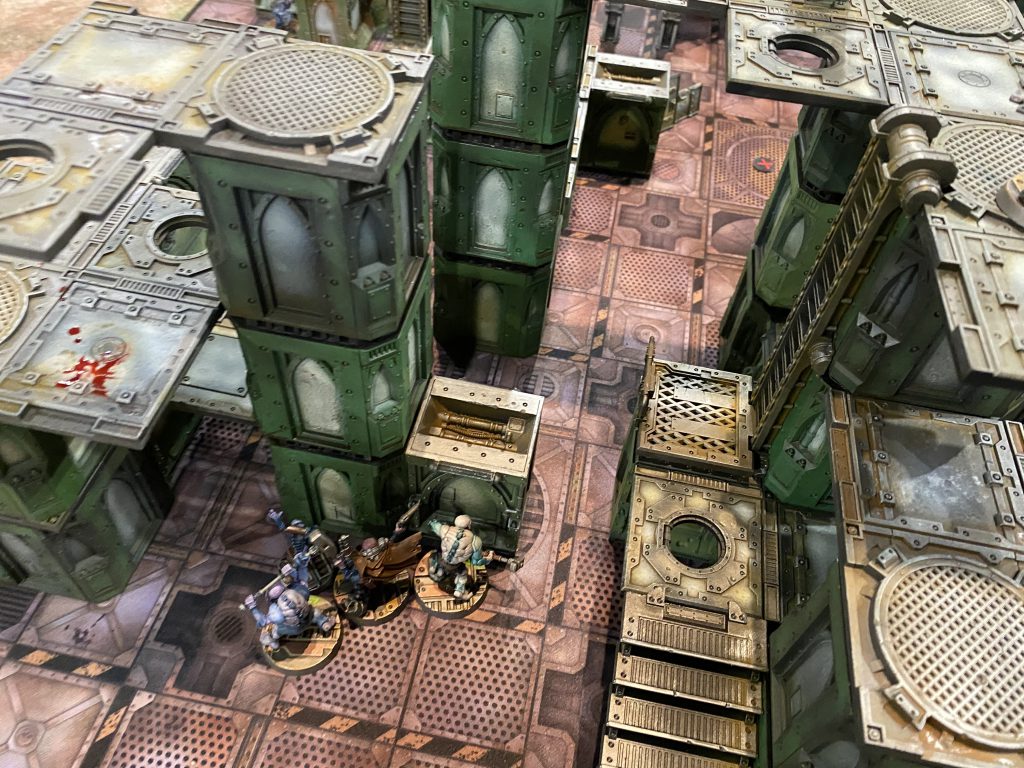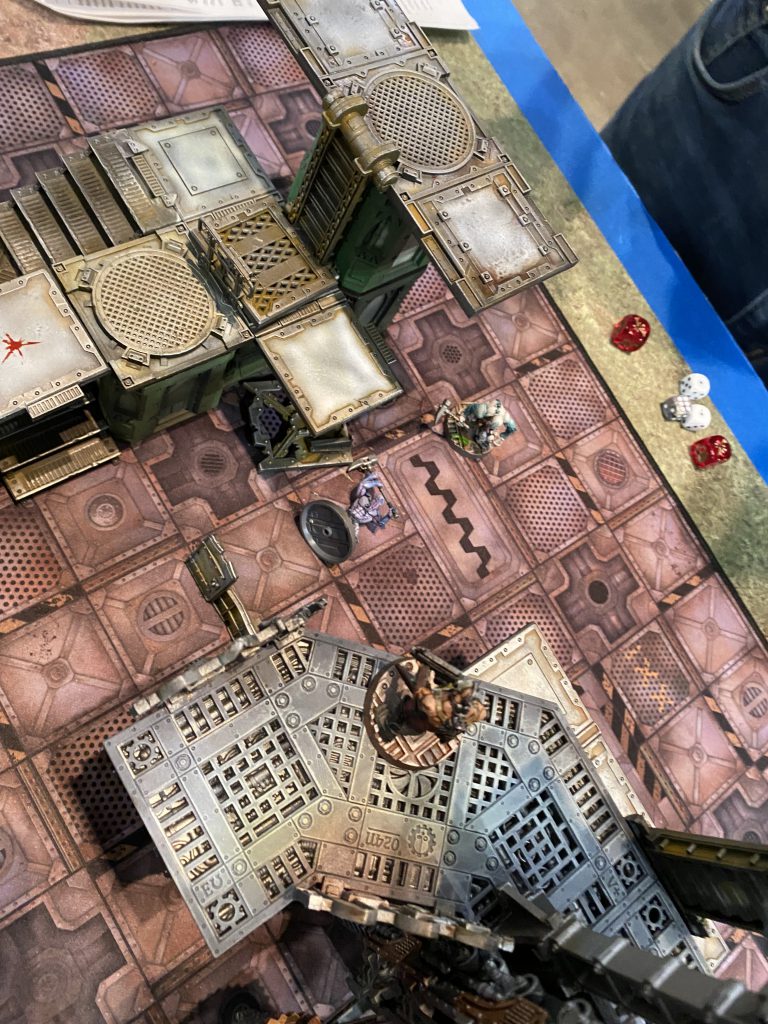 After a first round of largely dancing around one another trying to maneuver ourselves into position, Christian drew first blood by exploding one of my observing neophytes with a boltgun. What proceeded up top was a brief shoot out between two lasgun neophytes and the boltgun goliath while the other two ran away from two kitted out melee specialists (one so bulky with muscle that he could only move 3 inches) firing shots over their shoulders.