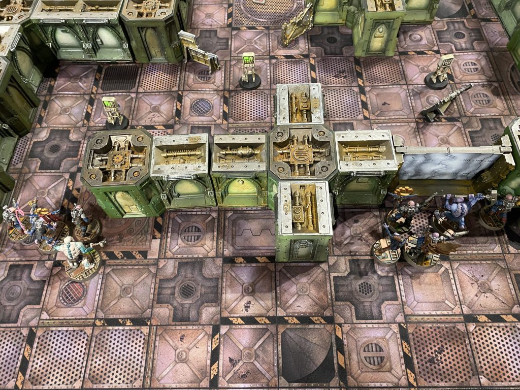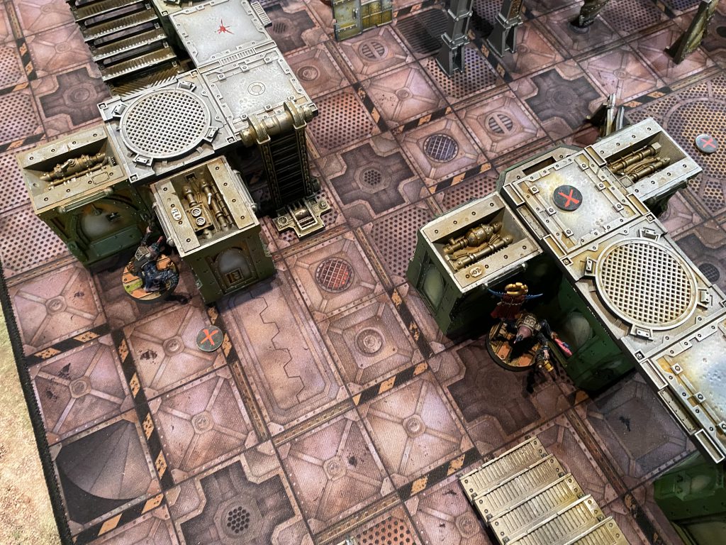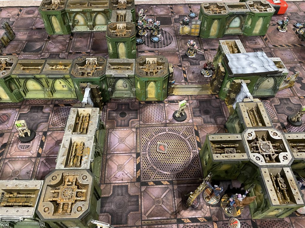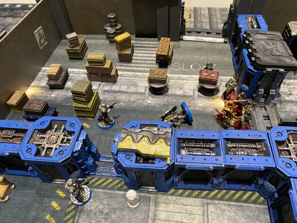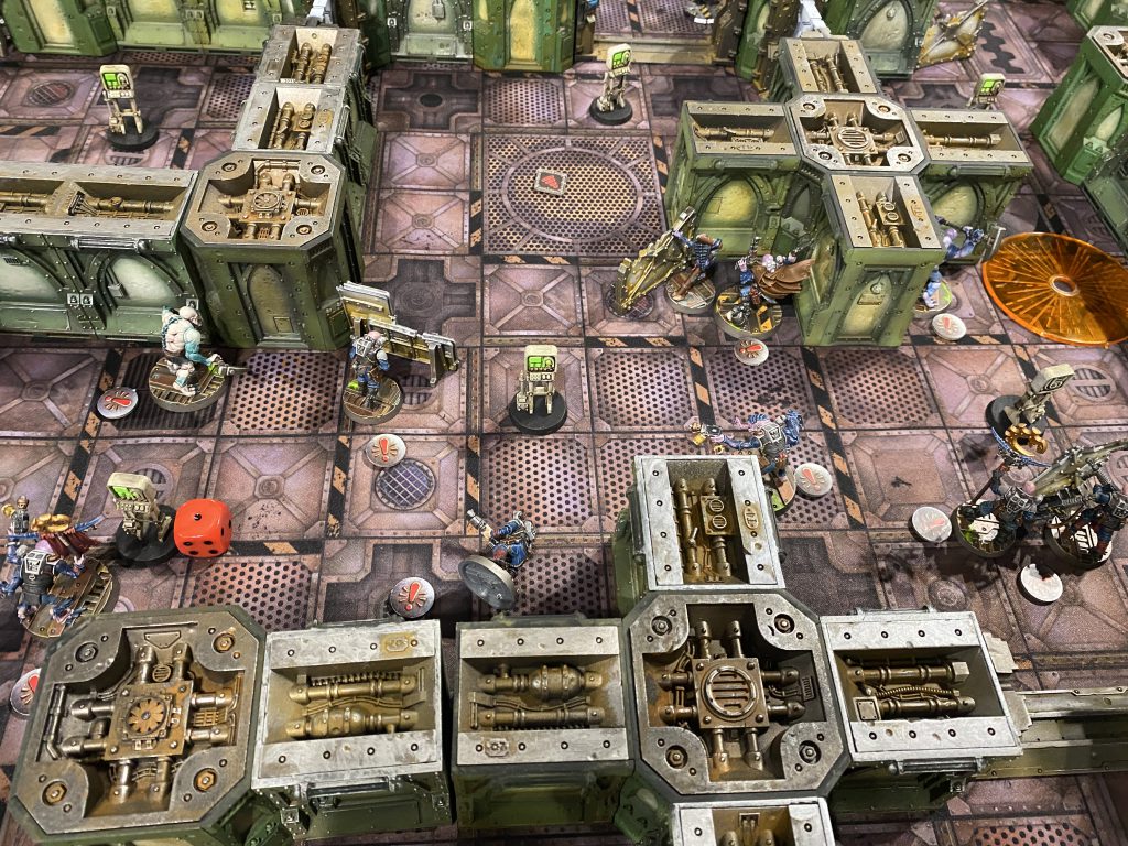 After a first round of largely dancing around one another trying to maneuver ourselves into position, Christian drew first blood by exploding one of my observing neophytes with a boltgun. What proceeded up top was a brief shoot out between two lasgun neophytes and the boltgun goliath while the other two ran away from two kitted out melee specialists (one so bulky with muscle that he could only move 3 inches) firing shots over their shoulders.