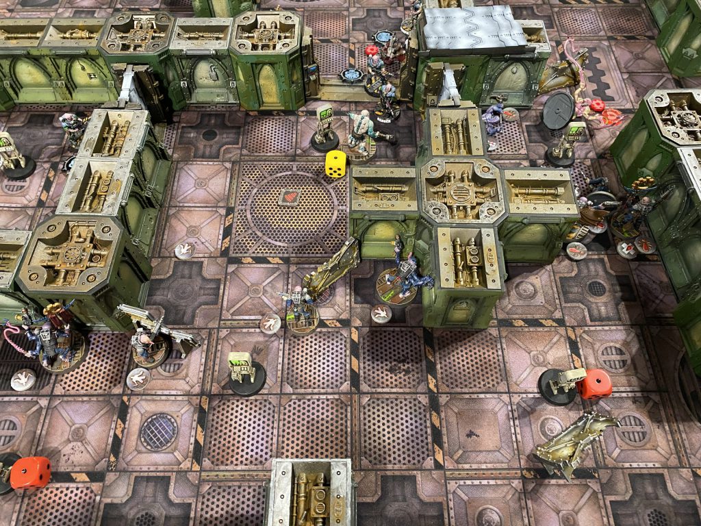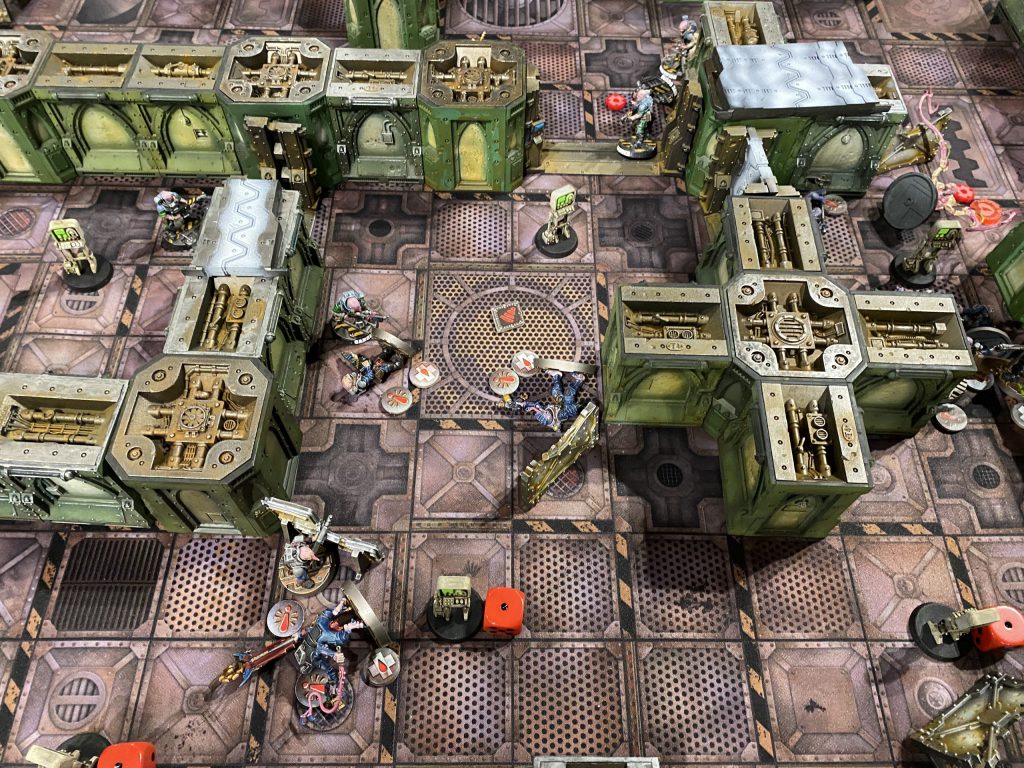 After scoring the terminals closest to my side I pushed my gang up to his terminals, which resulted in one of my aberrants getting domed by the heavy stubber, and the second being critically injured by his shock whip wielding aberrant, who was only saved from going OoA due to him staying out of base range via versatile, he had done this because he had not expected to do so thoroughly defeat my aberrant and wished to avoid my reaction attacks. My leader and 2 neophytes followed the aberrant and were able to kill Leland's before it could finish mine, but they found themselves harassed the whole way by his sniper champion.