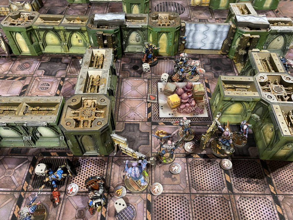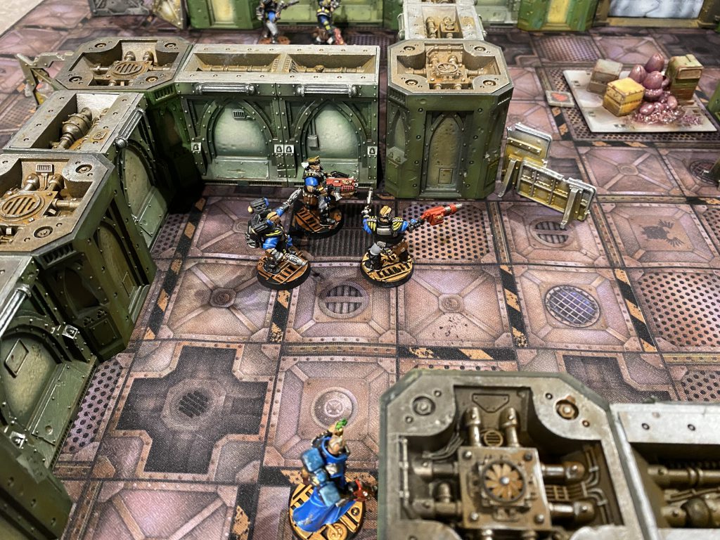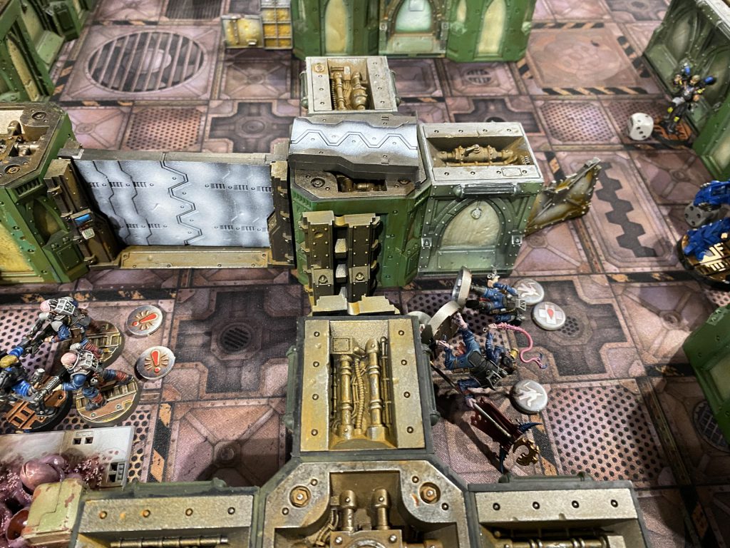 Meanwhile, on the ground Christian moved his meltagun champion out of cover, but only within range of my leader if I attempted a hip shooting action. This particular champion had -1 to dmg, so I decided to go big and risk taking him out early. He had mentioned the meltagun champion had been a bit of a terror in his previous games, so I made my move to take him out. My Alpha barreled around the corner, and I decided to HAM and overcharge all 3 plasma pistols. What proceeded was both his champion and my leader evaporating in a ball of blue flame as his guns exploded in his hands, but managing to land a hit on the champion in the process that took him OoA. I found this hilarious as I rarely overcharge plasma, and feel like it almost always goes poorly.
