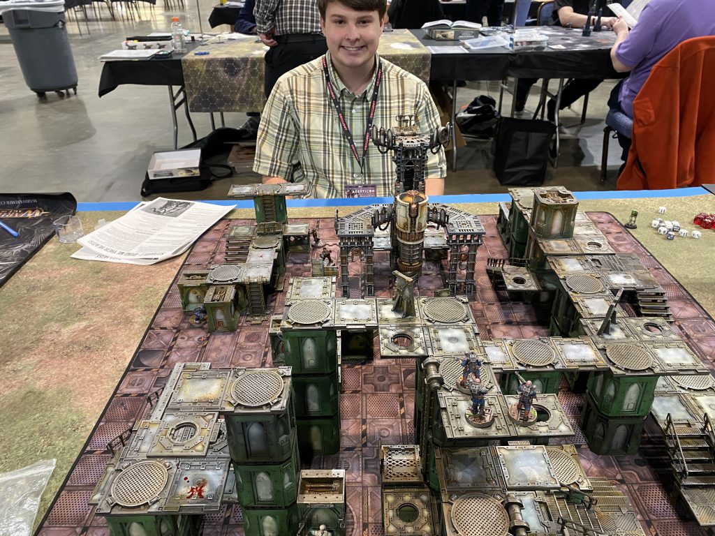 Tim was the senior half of a father/adult son combo present at the event, and clearly a guy there to have fun. He was talkative, and engaging the entire mission, and was a very fun guy to play with. That being said his gang definitely came prepared with him bringing a team of 9 including: an Ambot, 3 wreckers, a 4 wound leader with boltgun, champion with a hammer, champion with a boltgun, specialist with a grenade launcher, and a regular ganger with autogun? All his guys who could take Nerves of Steel had it, and were ready to through down.
