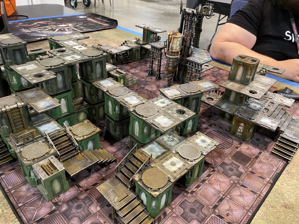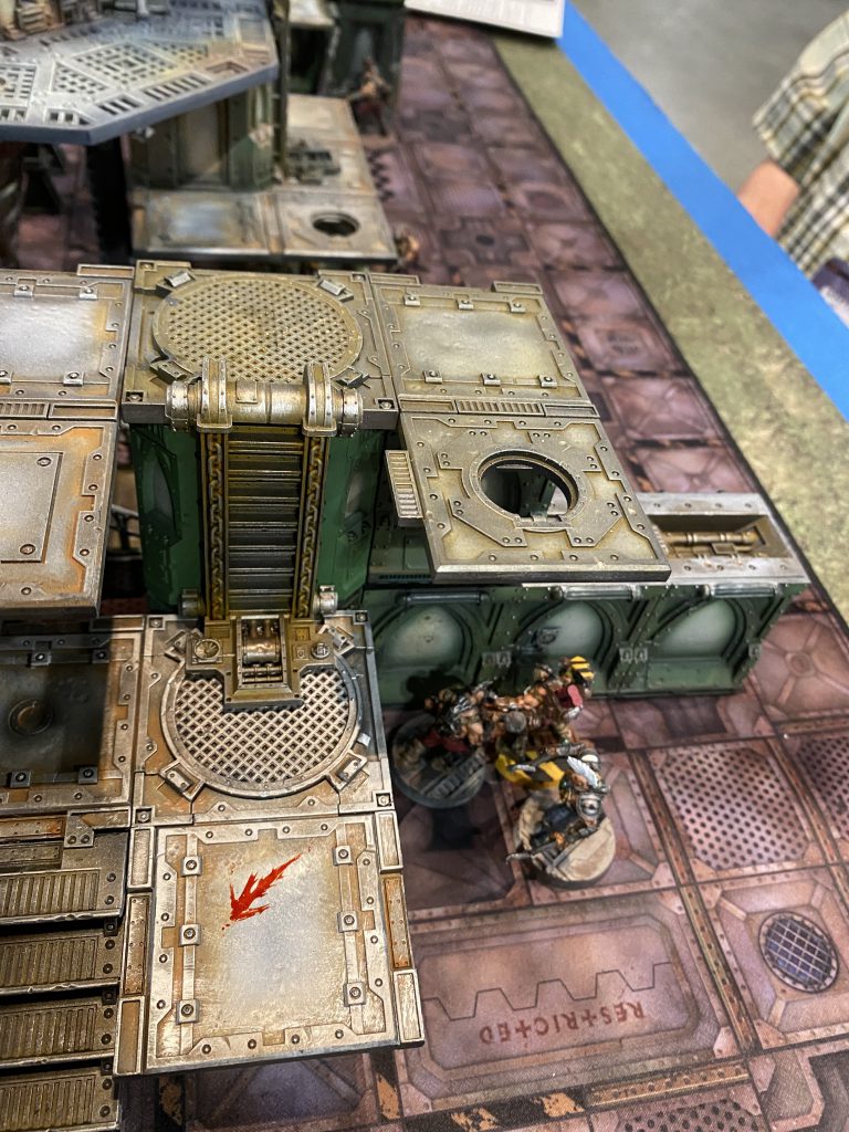 So if you have been reading my other Adepticon articles, especially my event overview this name might look familiar. Christian was my roommate for the weekend, and is local to me. He is a very avid Necromunda player, and knows the game inside out. We have a bit of a history where-in his Goliaths have tended to dominate our local campaigns, with my GSC being the only gang that has been able to thwart him. We have a large number of games against one another, and honestly I was thrilled to see he made it to the top round on his FIRST Adepticon. While my matches had all gone their full length Christian had apparently steam rolled his opponents. Opting to bring only 7 Goliaths loaded to the brim with gene-smithing buffs every single one of his guys was a powerhouse of muscle and incredibly lethal in close combat. Every champion, leader, and specialist had Nerves of Steel, and every single model was Toughness 5. In addition, more than a few models had 3 wounds (one had 4?), and one even had damage reduction. I can't give you the perfect breakdown because basically they were all tough to kill as far as my guys were concerned. We opted to play our final game on a Sector Mechanicus table, which were definitely the highlight of the event, fantastic setups.