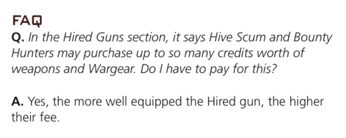In a huge ruling, Hired Guns’ (Bounty Hunters, Hive Scum, etc.) weapons and wargear are now explicitly part of their hiring fee, instead of a cheeky secondary charge. This is a great change and makes a ton of sense.
