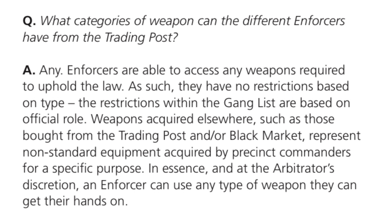 Now, this doesn’t mean that you or your Arbitrator has to allow this! Weapon access for Enforcers can still be houseruled as restricted, just as easily as it was house-ruled as okay before.
